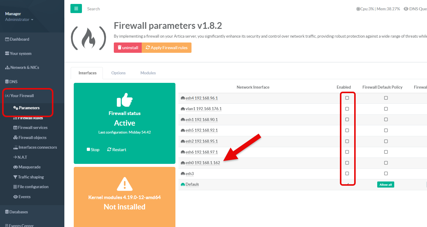 You must first specify which interfaces will use your firewall rules. Network Interfaces that are not activated in the firewall will not have rules.
