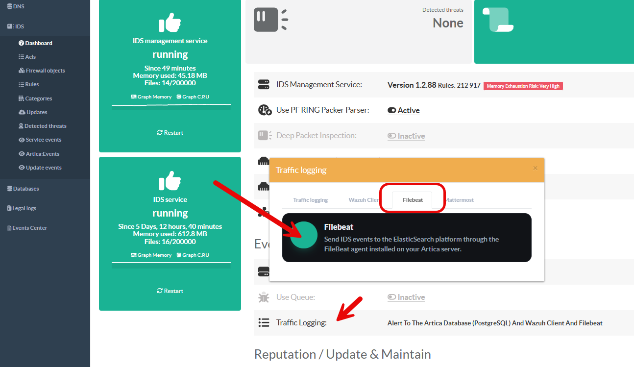 IDS > Dashboard, click on the Traffic Logging link