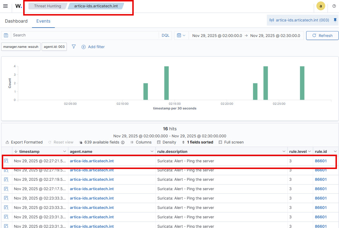 You will find events in the Threat Hunting section of your remote IDS Artica server with the rule.groups:suricata