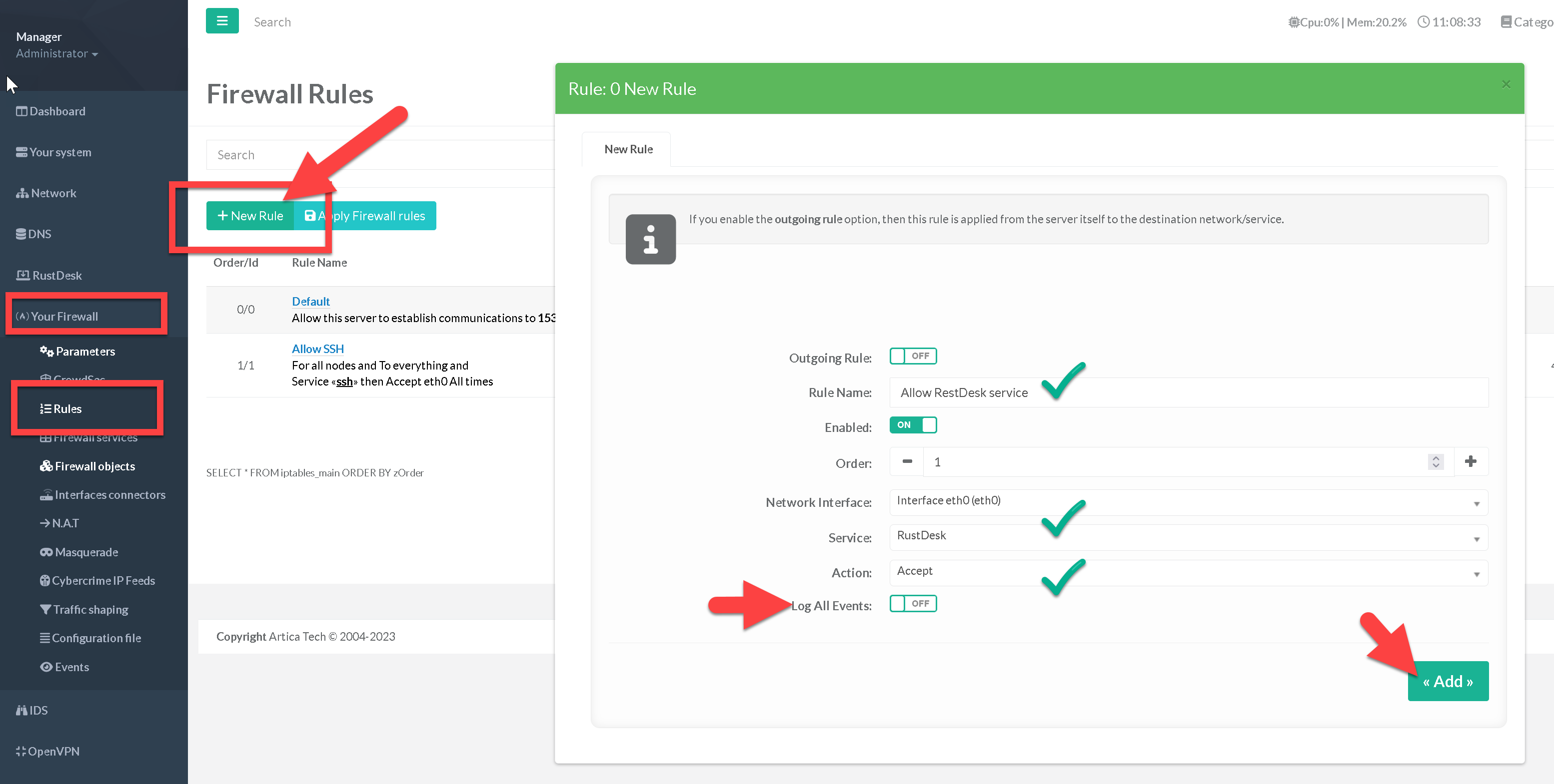 The Artica firewall already integrates the RustDesk object, so creating a rule for the RustDesk service is very simple.