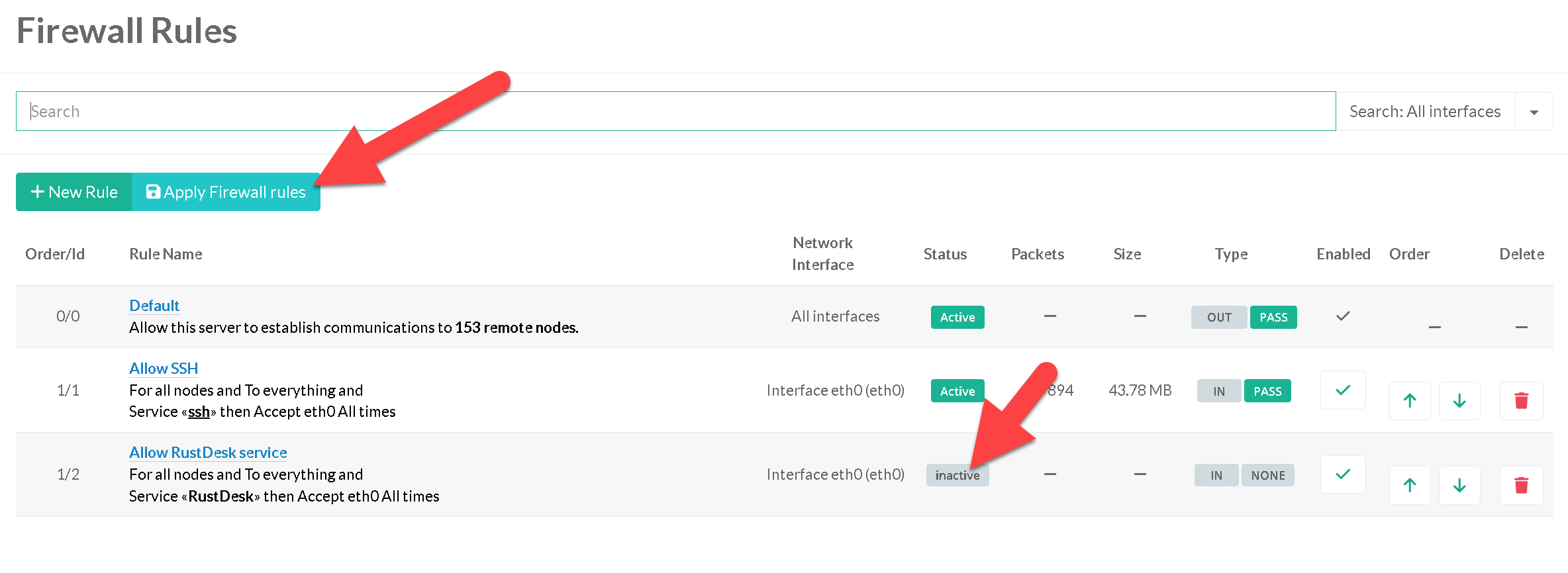 Once a rule has been added, it is displayed in the main table. You can see the status of the rule as "inactive". This is normal, as the rule has not yet been applied to the firewall, so you need to Apply Firewall Rules first.