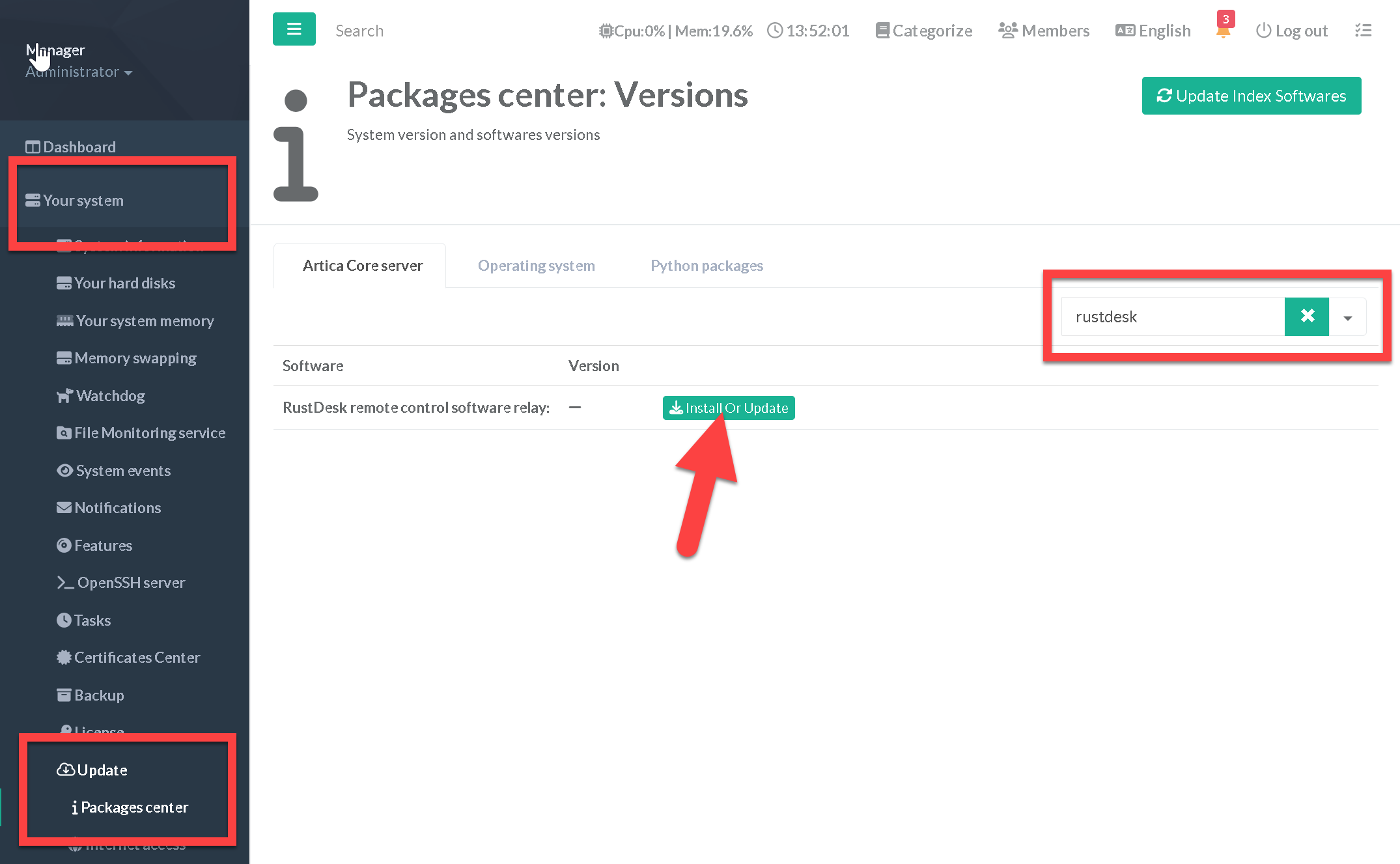 On the left menu, choose “Your System” > “Update” > “Packages Center”