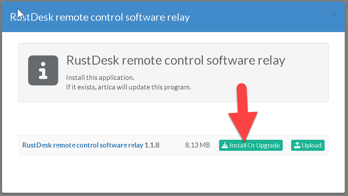 Click on Install Or Upgrade button on the RustDesk remote control software relay row