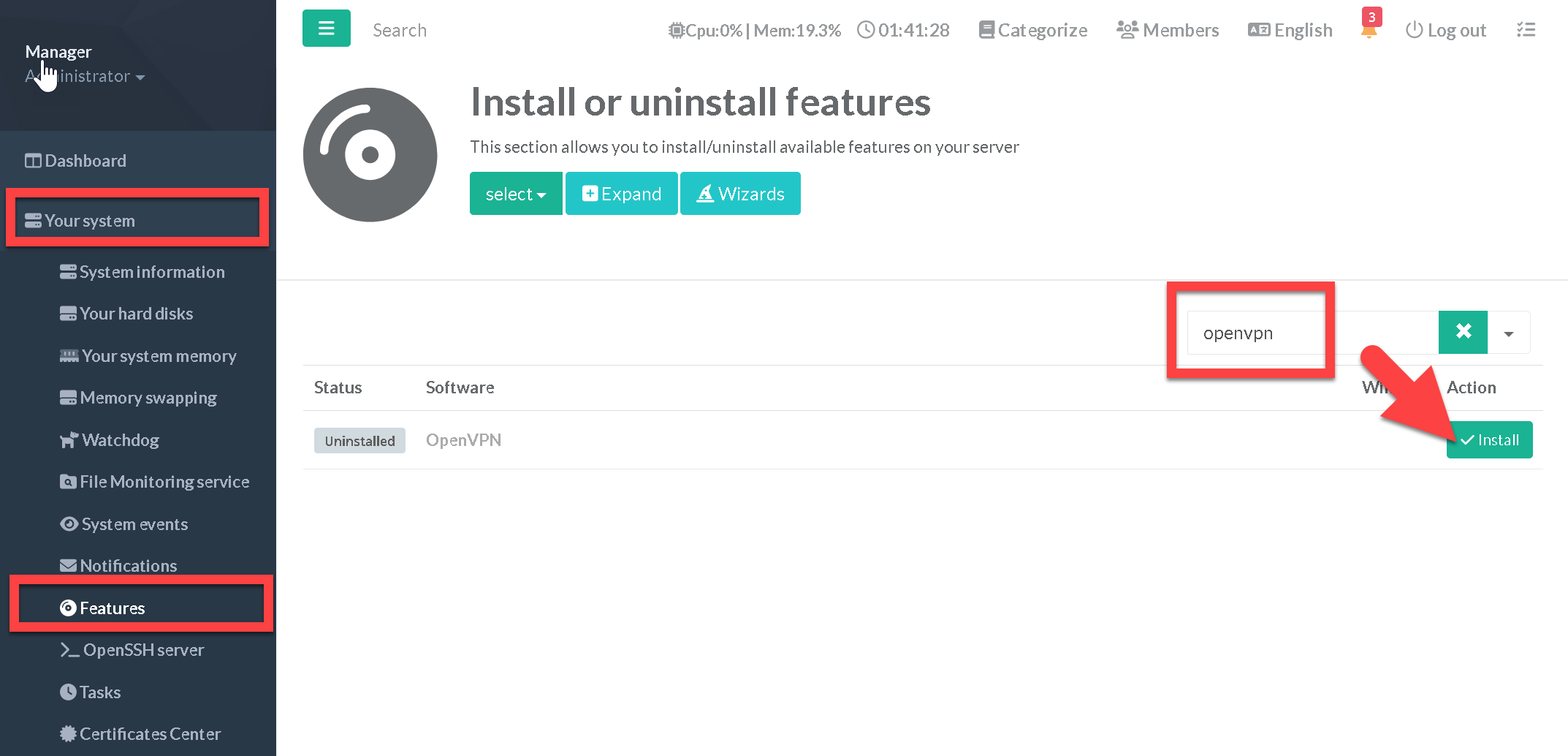 Once you've installed OpenVPN components, you can activate OpenVPN feature.