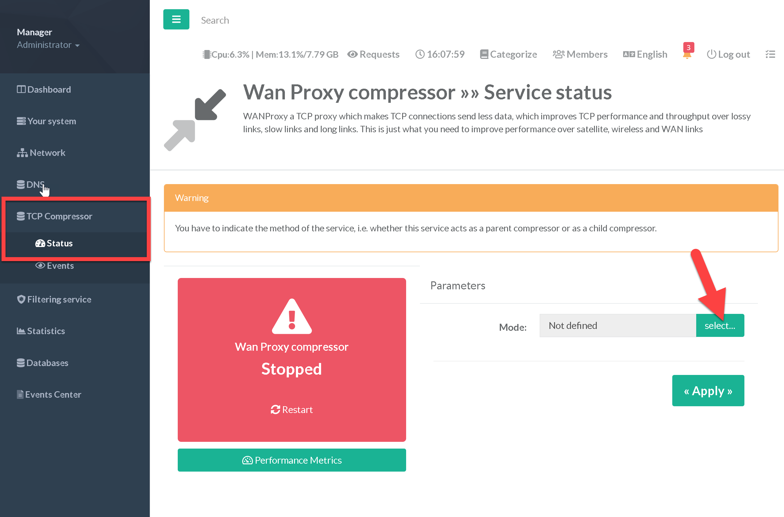 A new menu “TCP Compressor” is displayed, Click on “Status” sub-menu