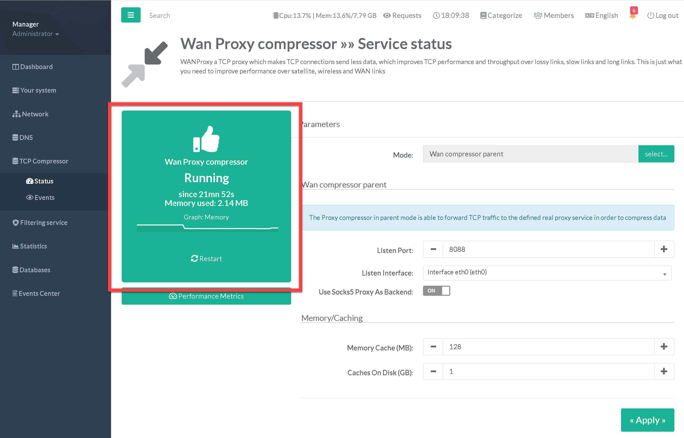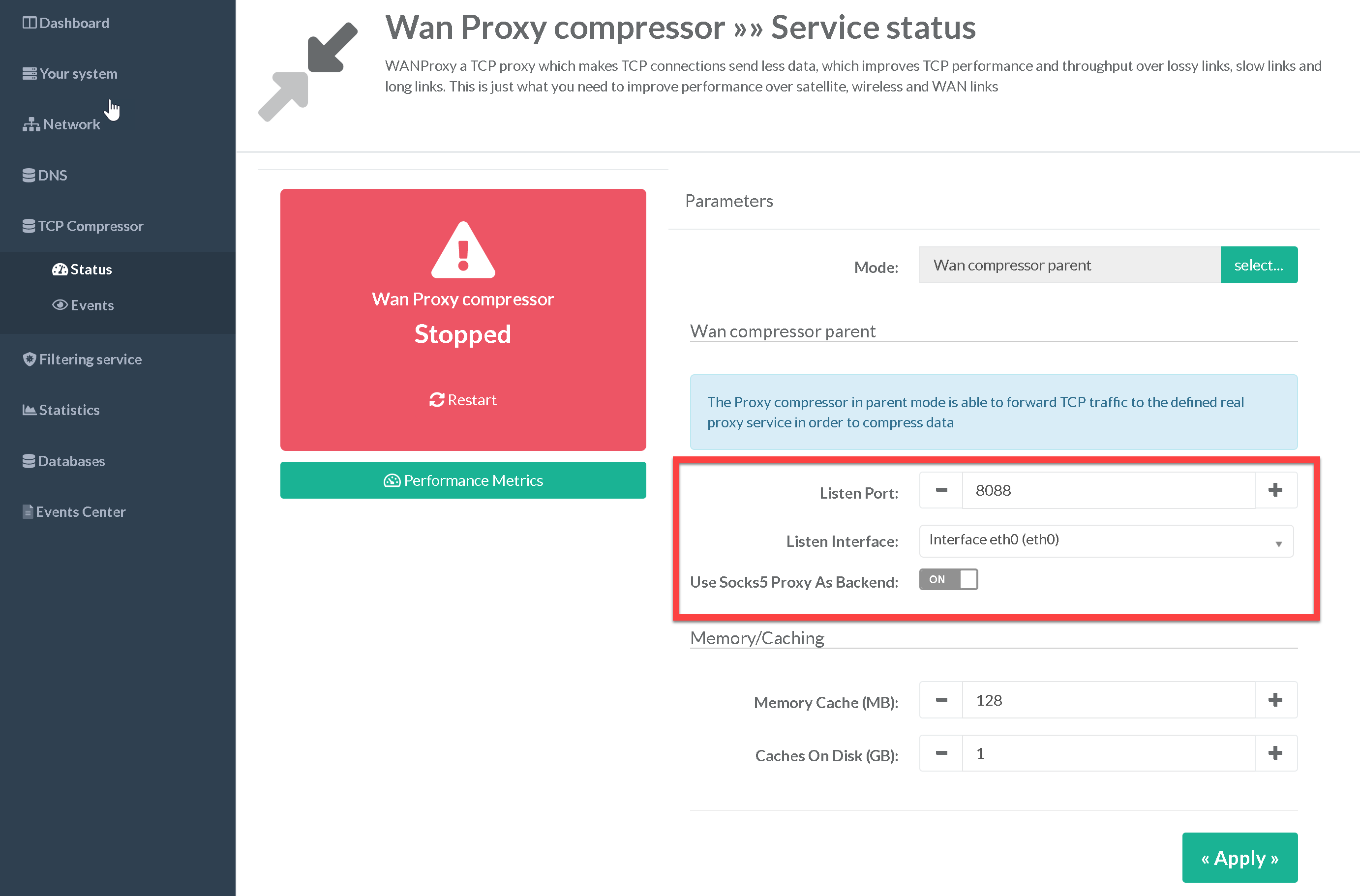 Set the Listen Port of your Wan Proxy Compressor and define the listen interface and click on Apply Button.