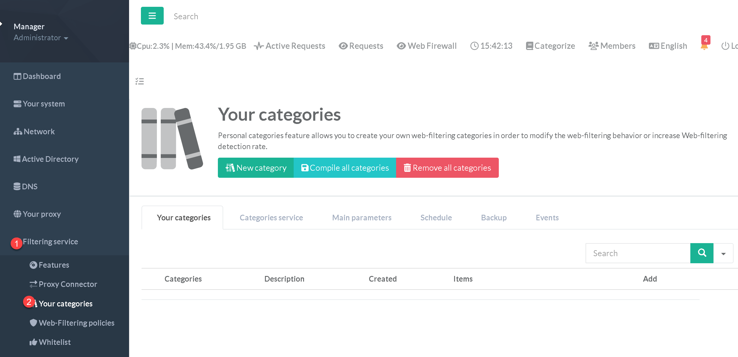 Personal categories can be used by the proxy with the Web-Filtering service ACLs categories objects, DNS firewall and feed the categories service