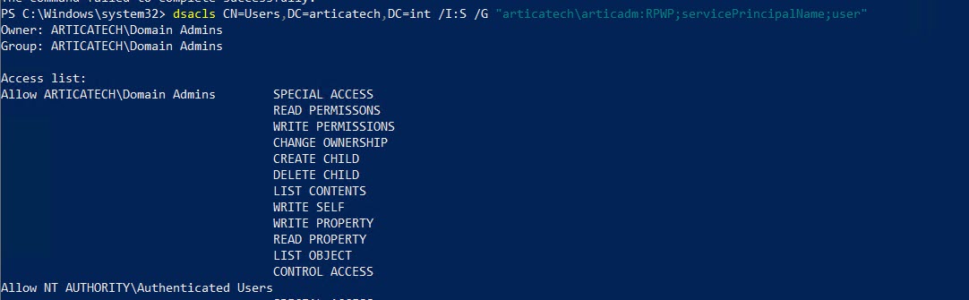 dsacls CN=Users,DC=articatech,DC=int /I:S /G "articatech\articadm:RPWP;servicePrincipalName;user"