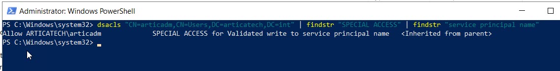 dsacls "CN=articadm,CN=Users,DC=articatech,DC=int" | findstr "SPECIAL ACCESS" | findstr "service principal name"