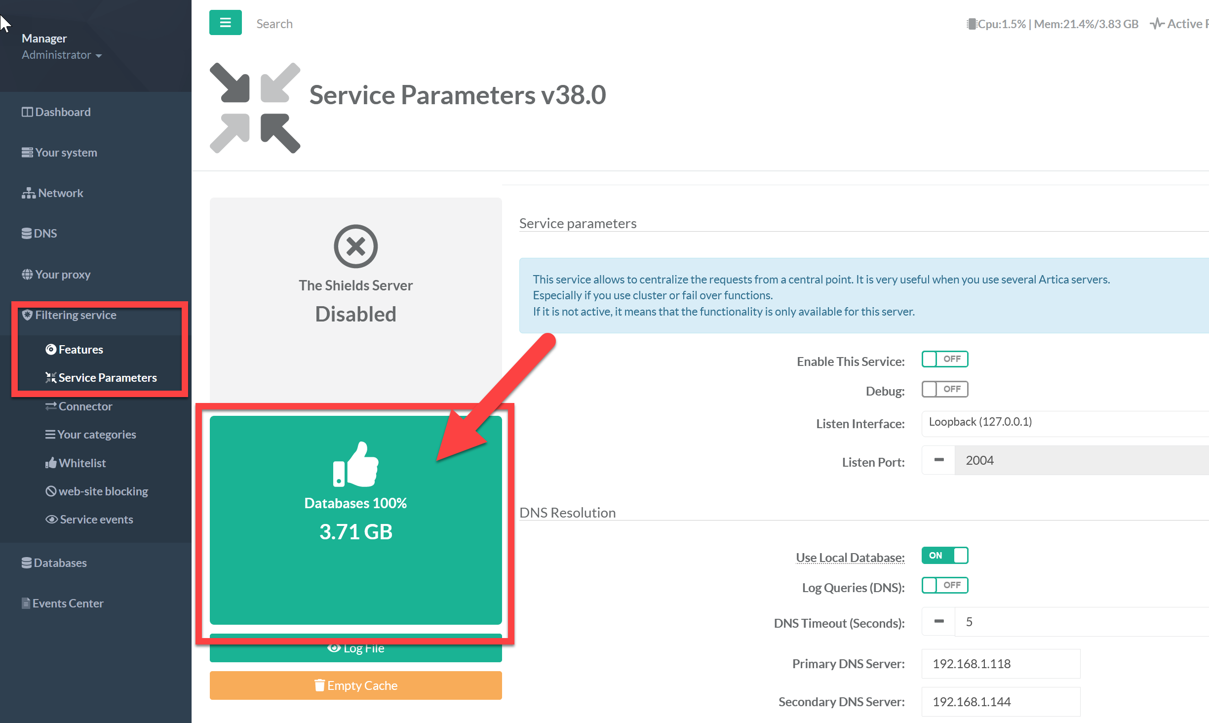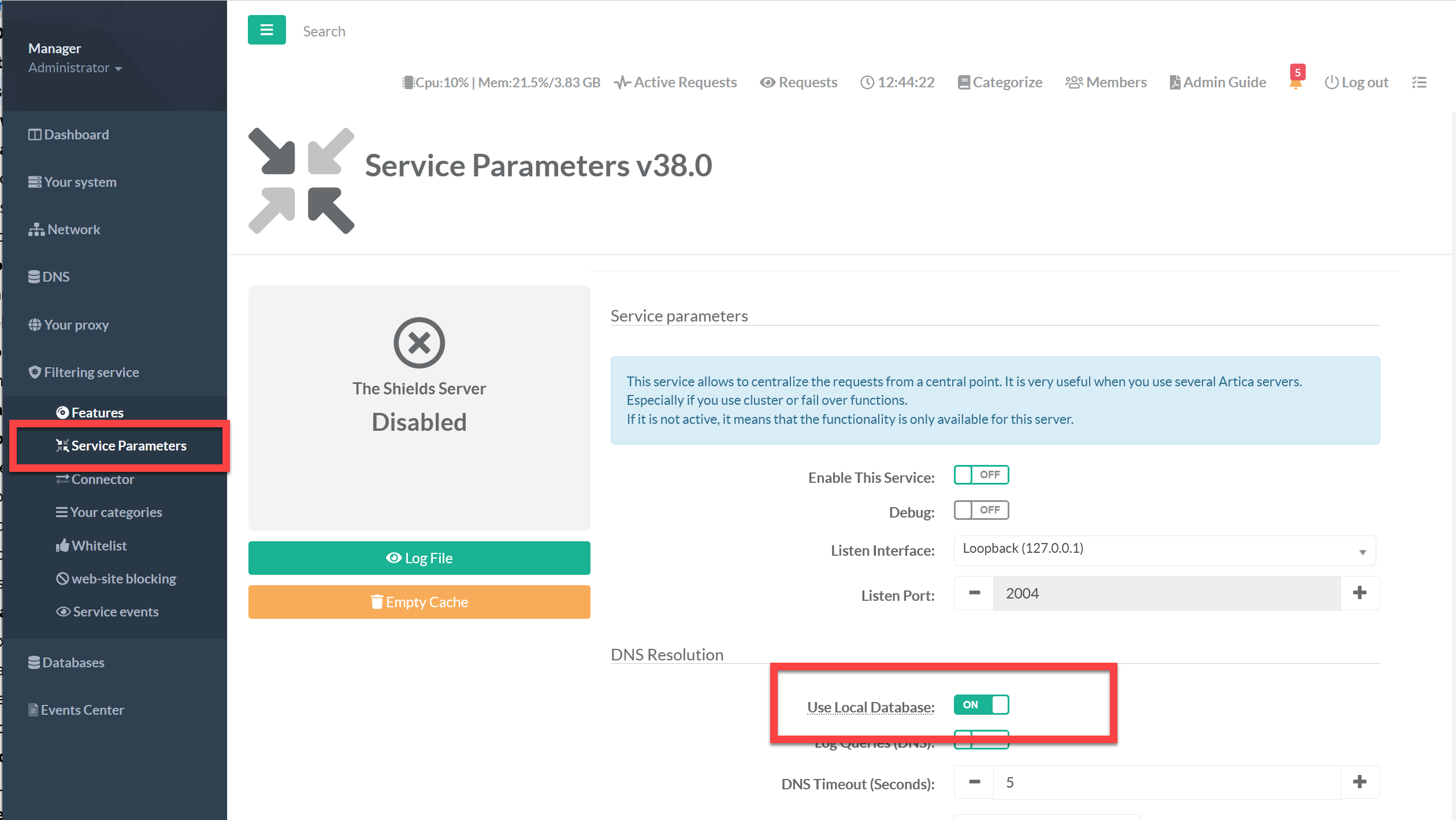 Under Filtering Service / Service Parameters enable only the Use Local Database option.