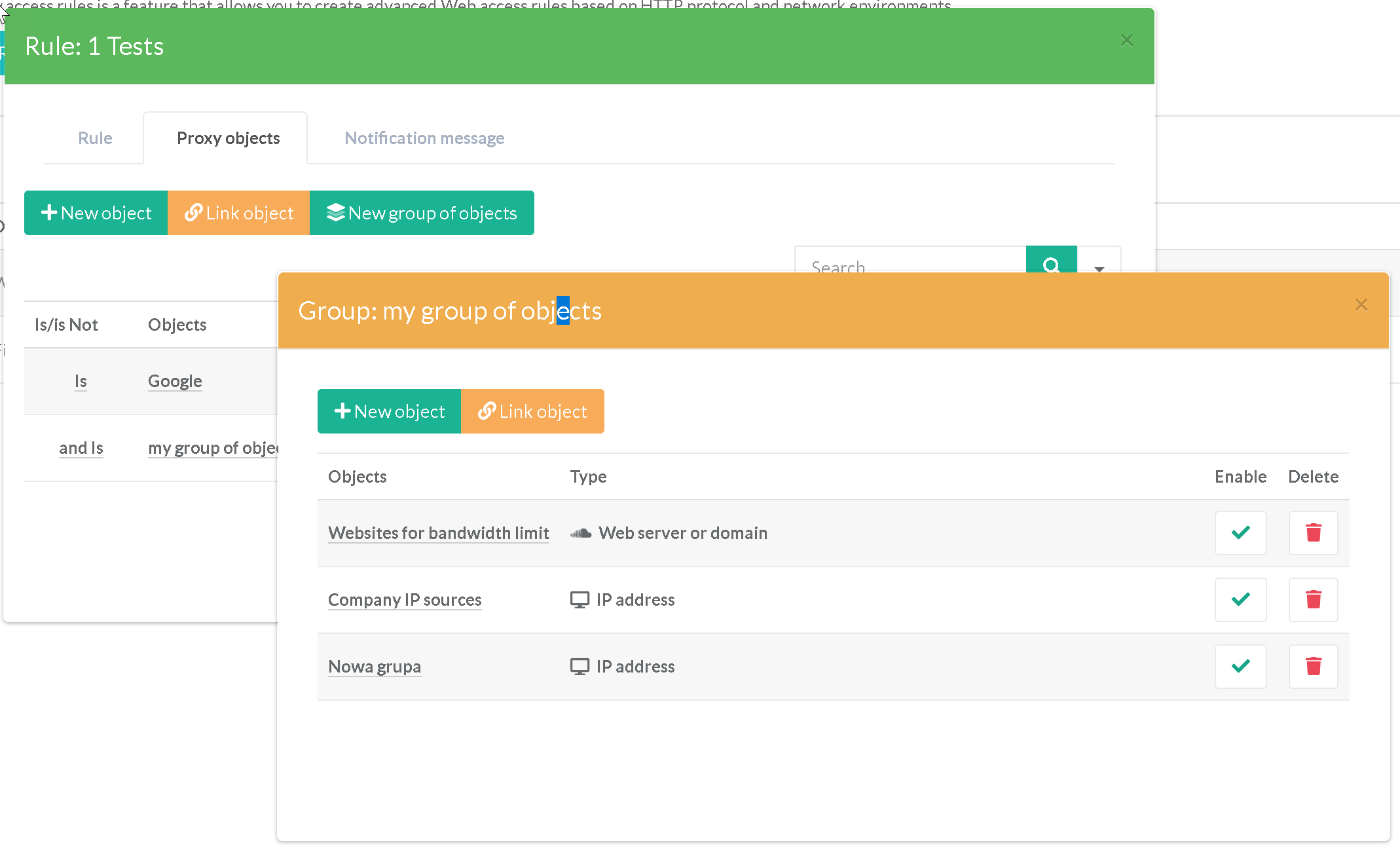Detects if request going to google domains AND if client is a part of network listed in “Company IP sources” OR if website is listed in “Websites for bandwidth limit” OR if client is a part of “Nowa grupa”