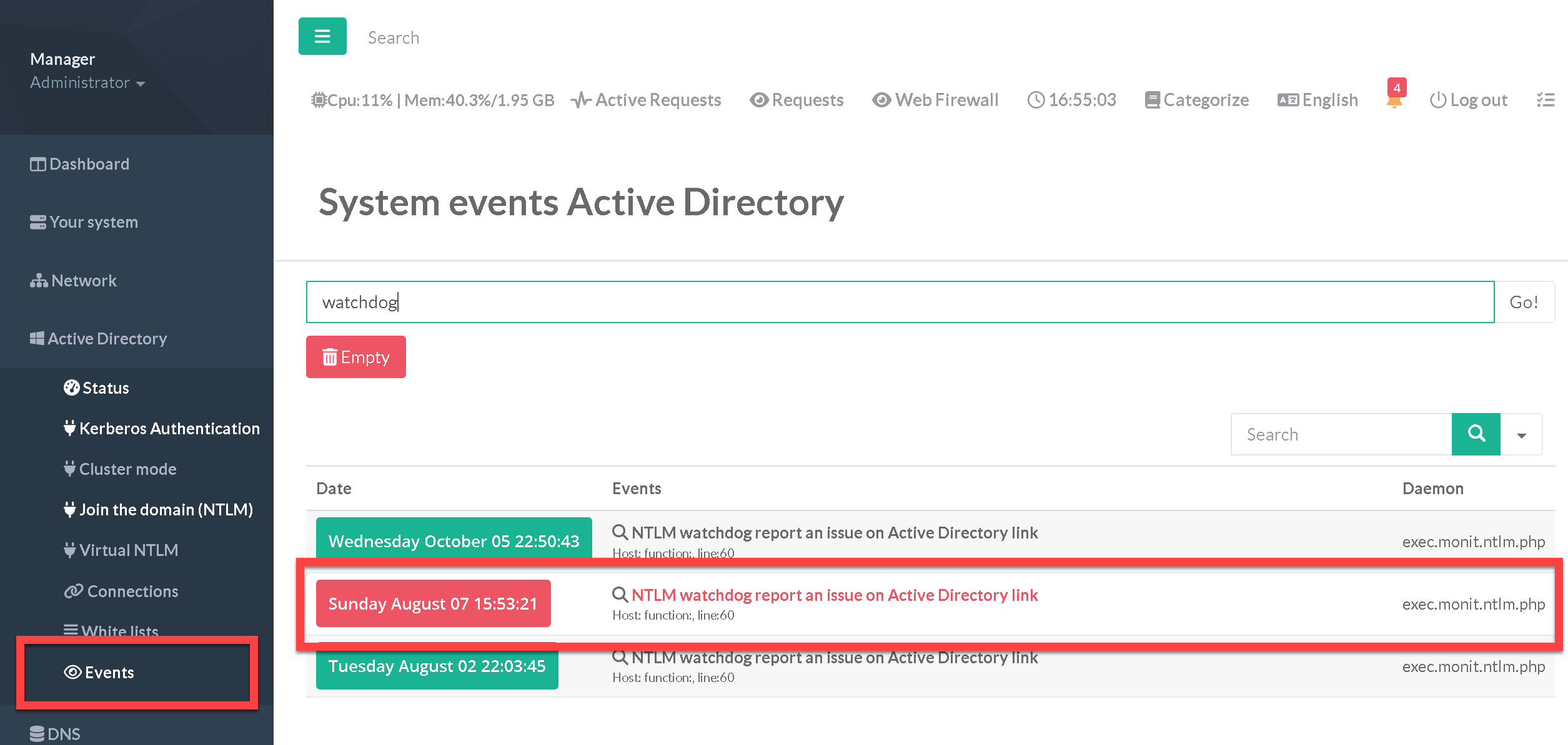 Turn into the emergency mode Automatically. The emergency mode allows everyone to go through the proxy without any authentication. In this case, a connection error will have little impact on your users. By default, this feature is disabled, the watchdog leaves the proxy as is. Turn ON if you want to activate the emergency mode. When the watchdog has activated the emergency mode, it will continue to monitor. If new tests are then concluded to be successful, i.e. that the Active Directory link has been re-established, then the emergency mode will be automatically removed and the proxy will return to normal mode.