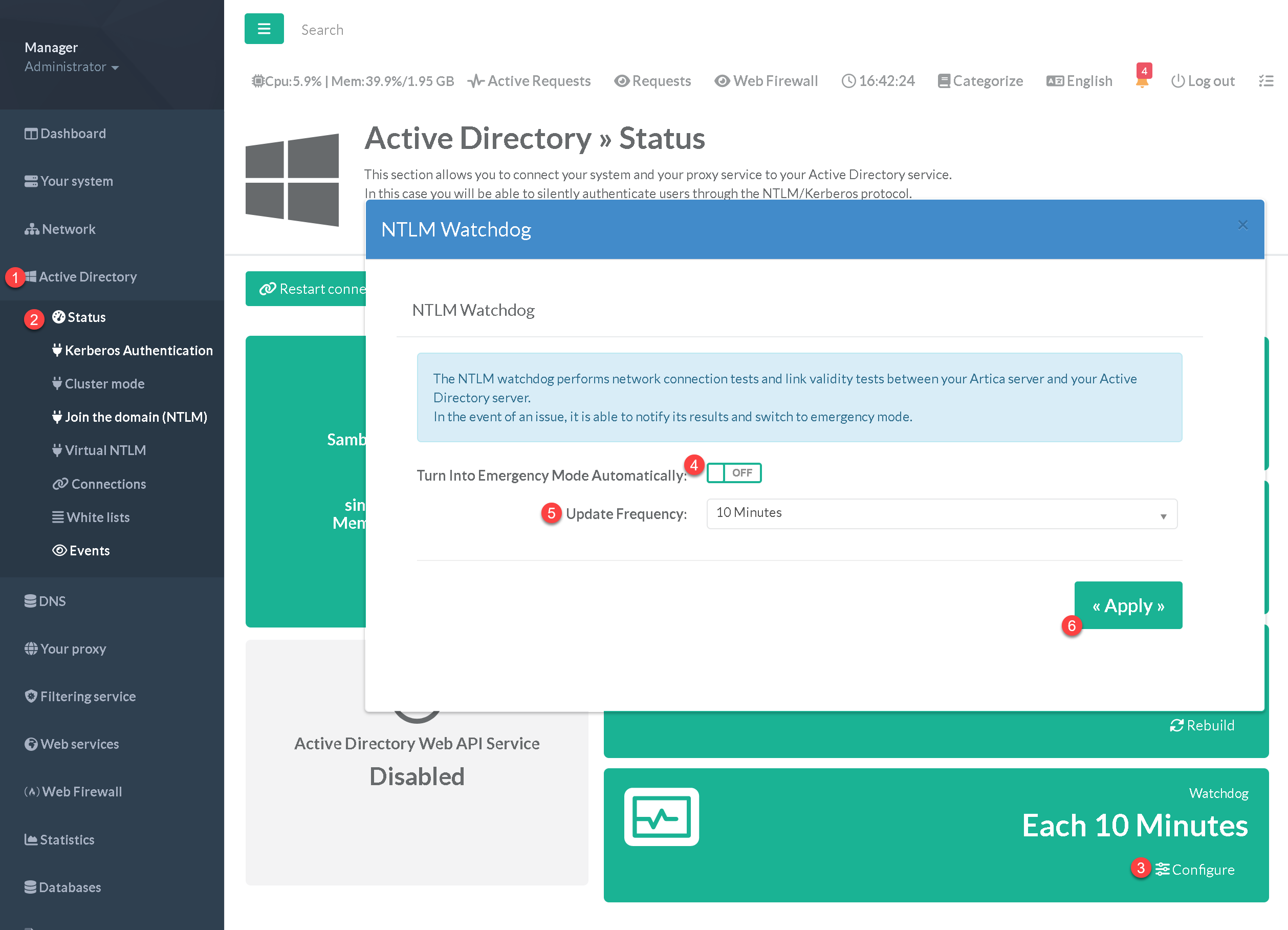 Update frequency. The service performs network and system compatibility tests to ensure a good relationship between your Artica box and your Active Directory server. If one of the tests fails, the service will react immediately (by default, do nothing but notify) The frequency of these tests is done by default every 10 minutes. It is up to you to evaluate this frequency. Indeed, with a frequency of every 10 minutes, if a problem occurs between the two tests, you may not be informed or the emergency mode may not be activated for a maximum of 10 minutes.