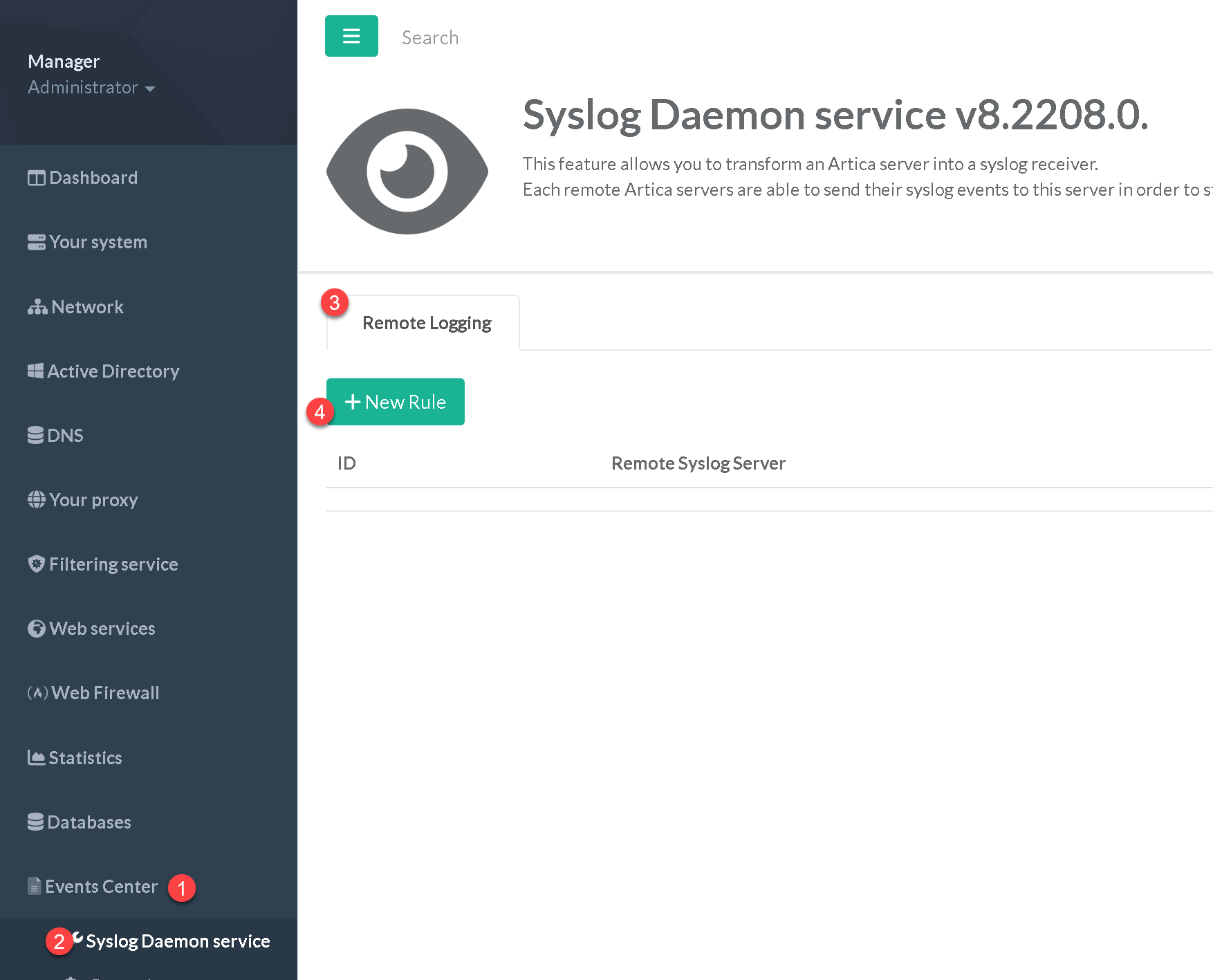 - This feature is available using the left menu, choose Events Center > Syslog Daemon service.