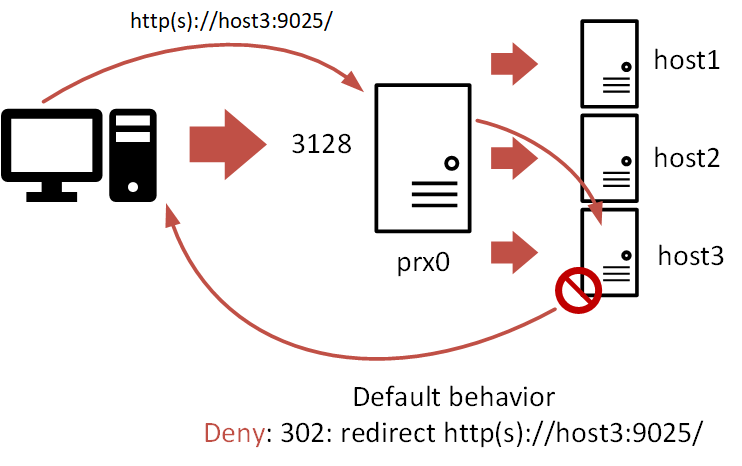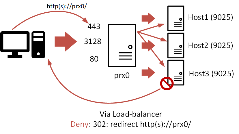 The browser continues to operate the same way when accessing the Internet, but when a website is blocked, the backend (host3) instructs the browser to contact the load balancer directly (prx0) as the final destination for the error page service.
