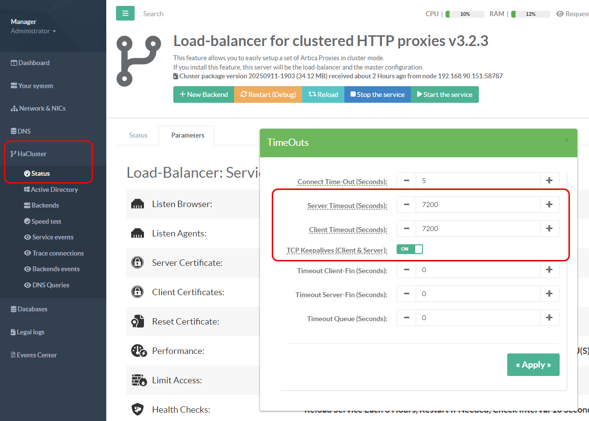 Configure the load balancer to support these use cases.The TCP Keepalives option is available with Artica v4.50 Service Pack 6 or Artica v4.50 Service Pack 5 Hotfix 20250910-20