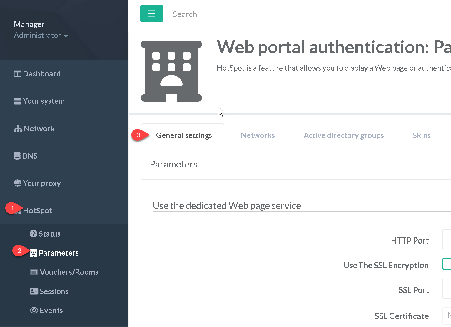 On the left menu, go to “HotSpot” > “Parameters” and use the General settings tab