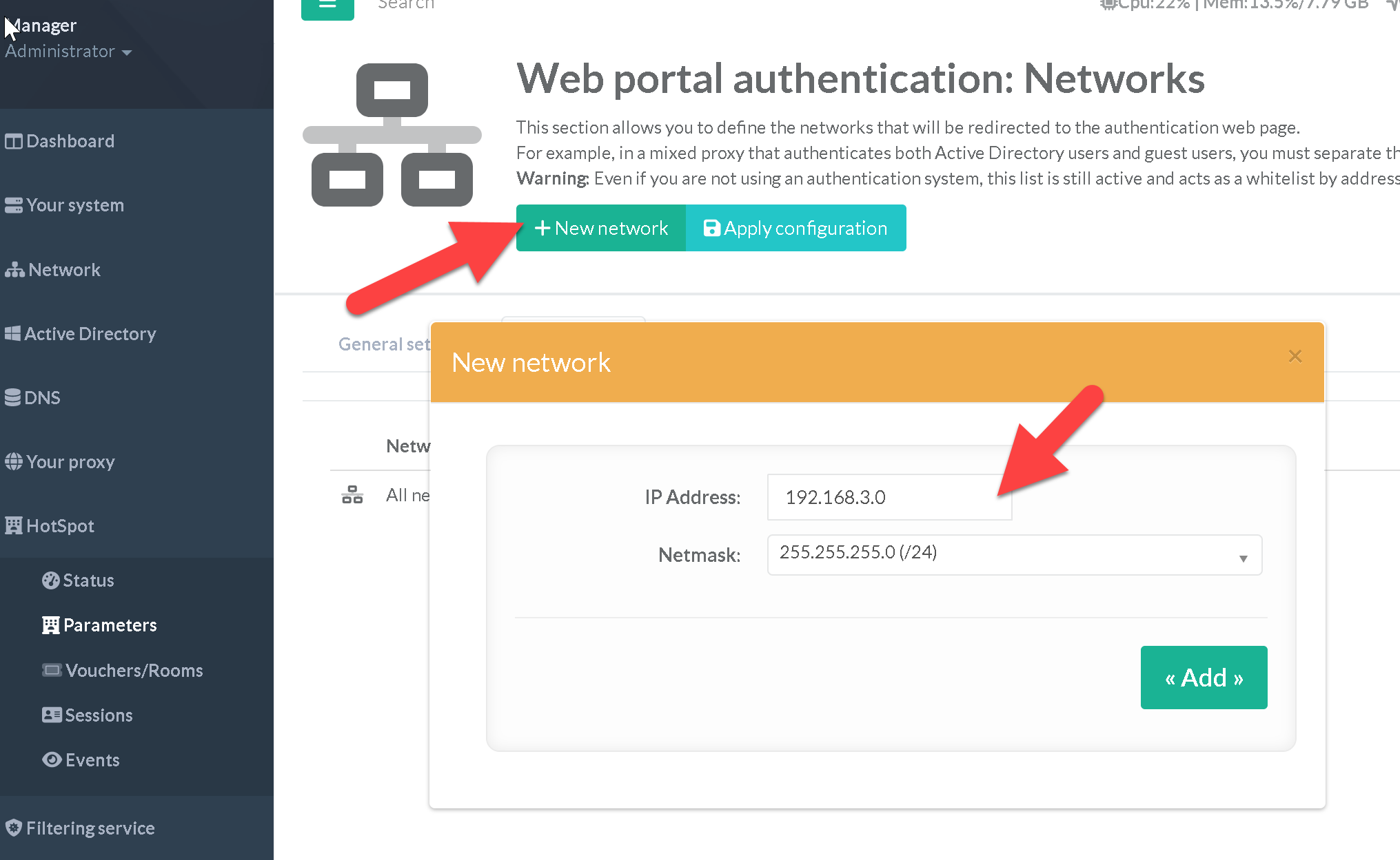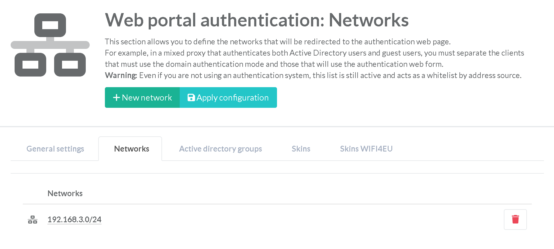 This section allows you to define the networks that will be redirected to the authentication web page.