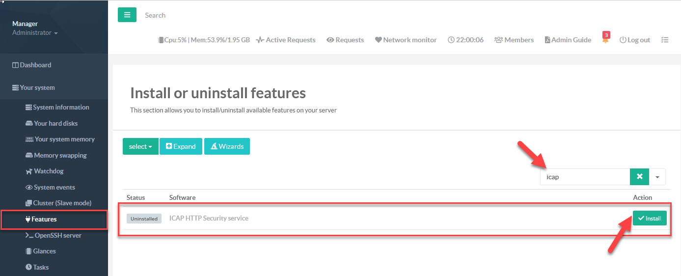 The ICAP service can be installed using the features section