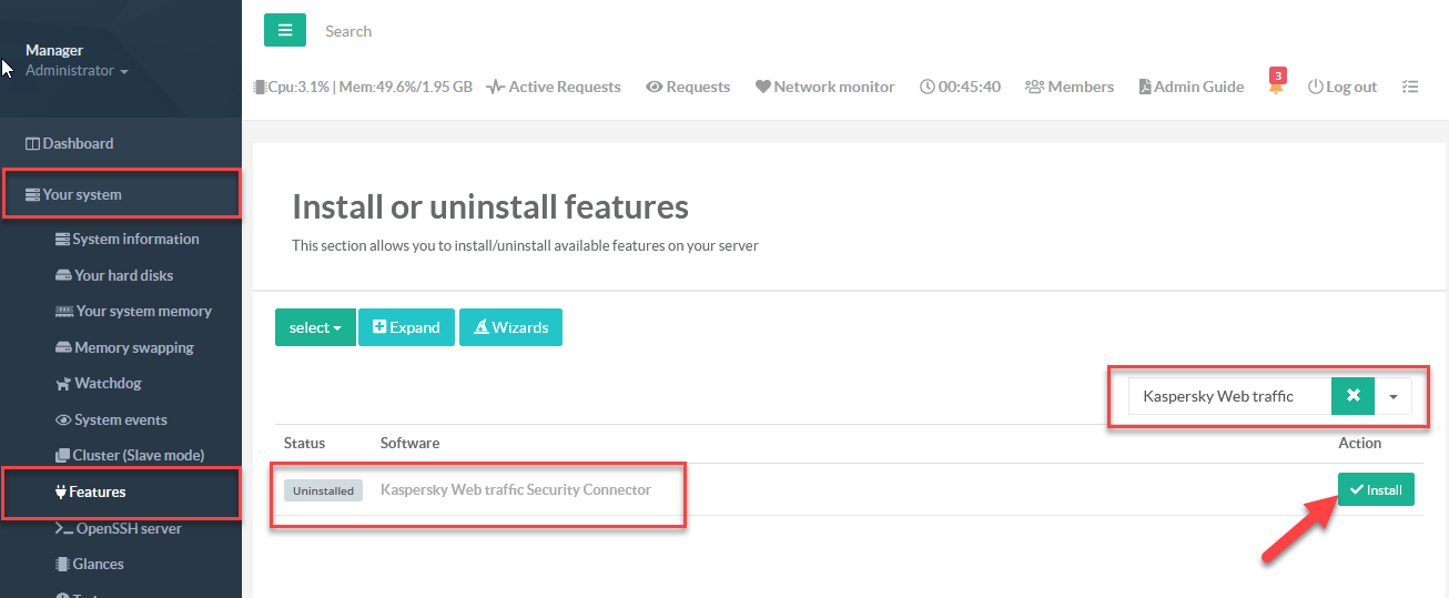 - Click on Install button on the Kaspersky Web traffic Security Connector row