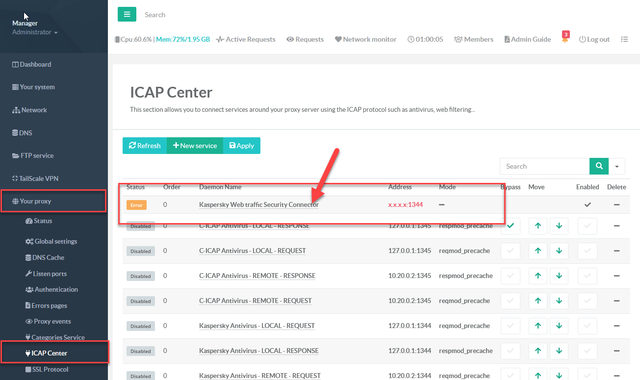 - On the left menu, choose “Your Proxy” / “ICAP Center”