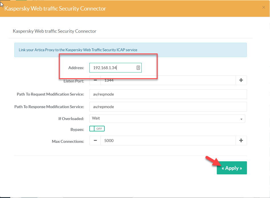 Set the remote Address of your Kaspersky Web traffic Security server in the Address field and click on Apply button.
