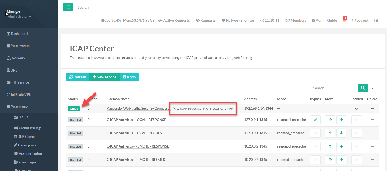 - In the table, you should see the “Status” in Active mode and the remote ICAP service signature.