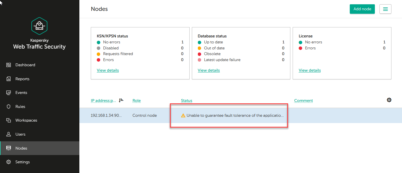 If you install only a single machine, the current node that act as Central node and scanner node claim “Unable to guarantee fault tolerance of the application: no servers with Secondary node role”