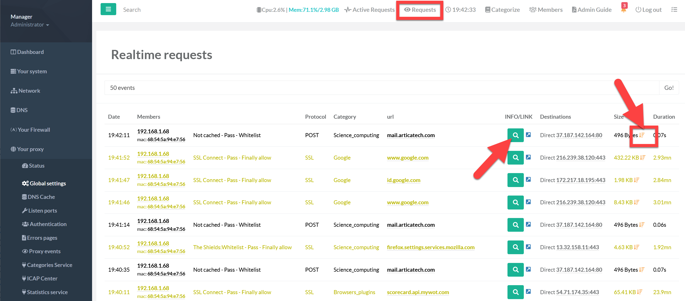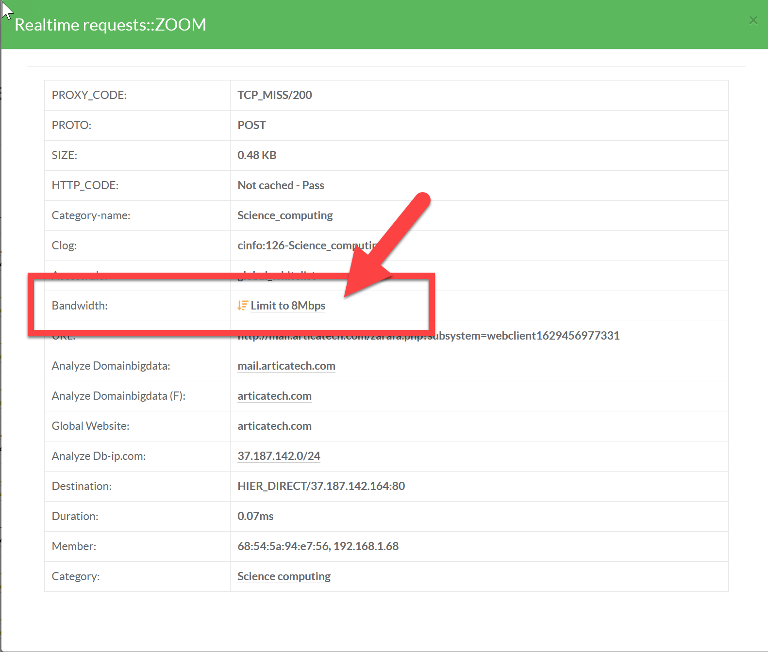 - If an bandwidth acl matches, means the request is limited by a bandwidth rule, an icon is displayed near the size of the request.