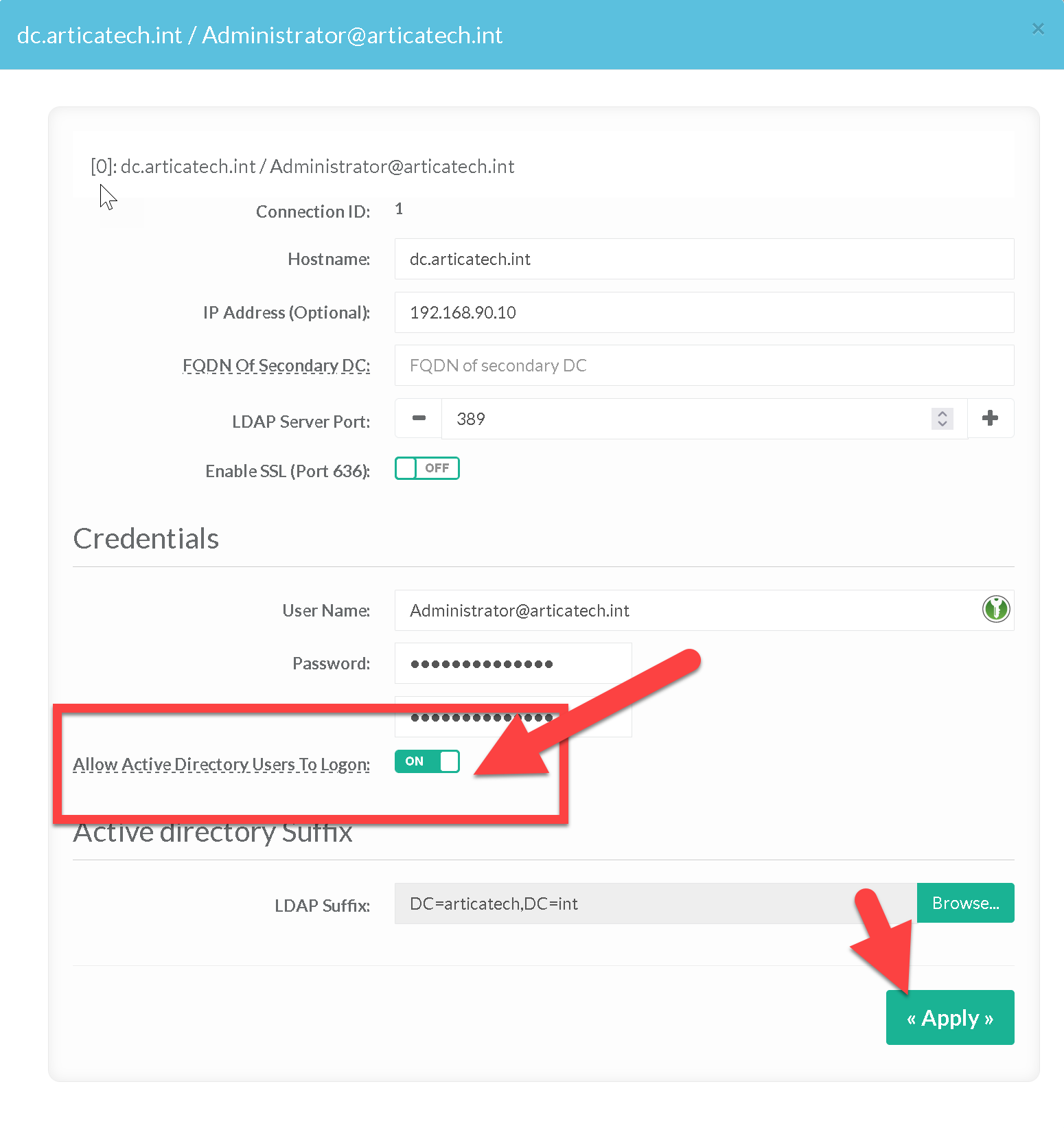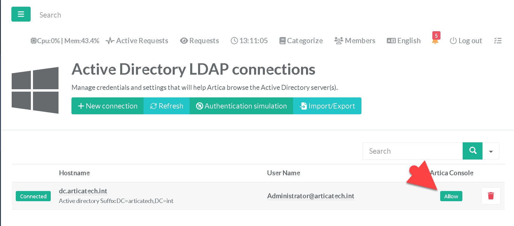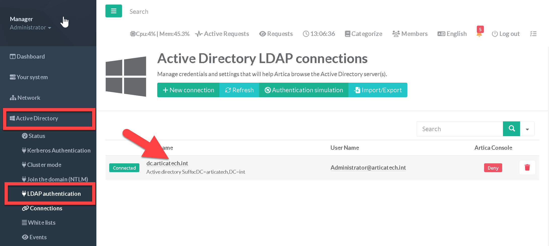 In the Active Directory context, you must specify in the LDAP connections that the Active Directory connection is also authorized to check user accounts when connecting to the Artica login page.