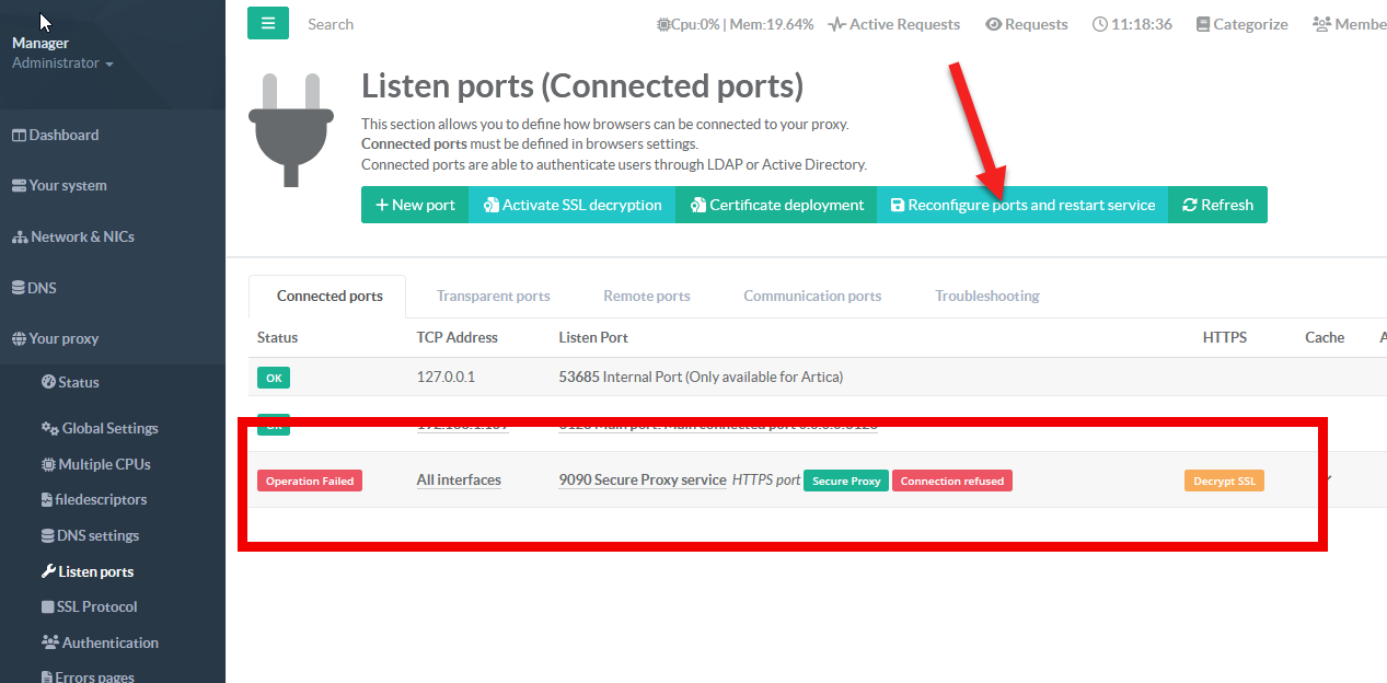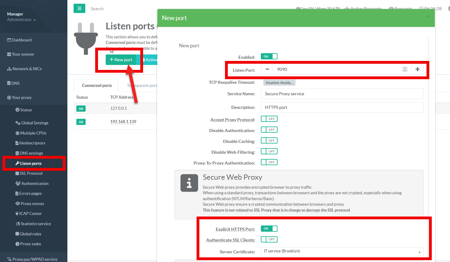Creating a Secure Port will activate an HTTPs port that will be used by your browsers to use the proxy and browse the Internet.