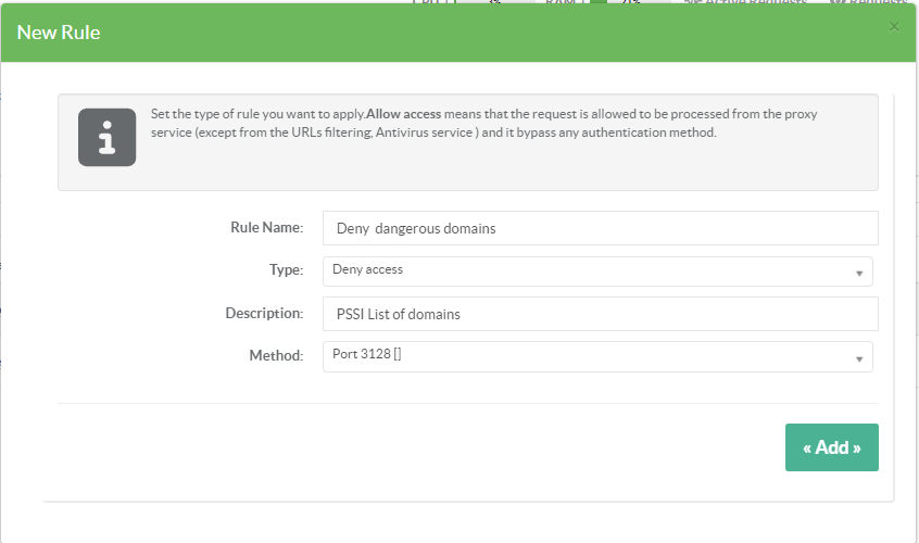 Allow Access: Tells the proxy that requests does not require authentication and will pass through all advanced rules. The request is still subject to the Web filtering service.