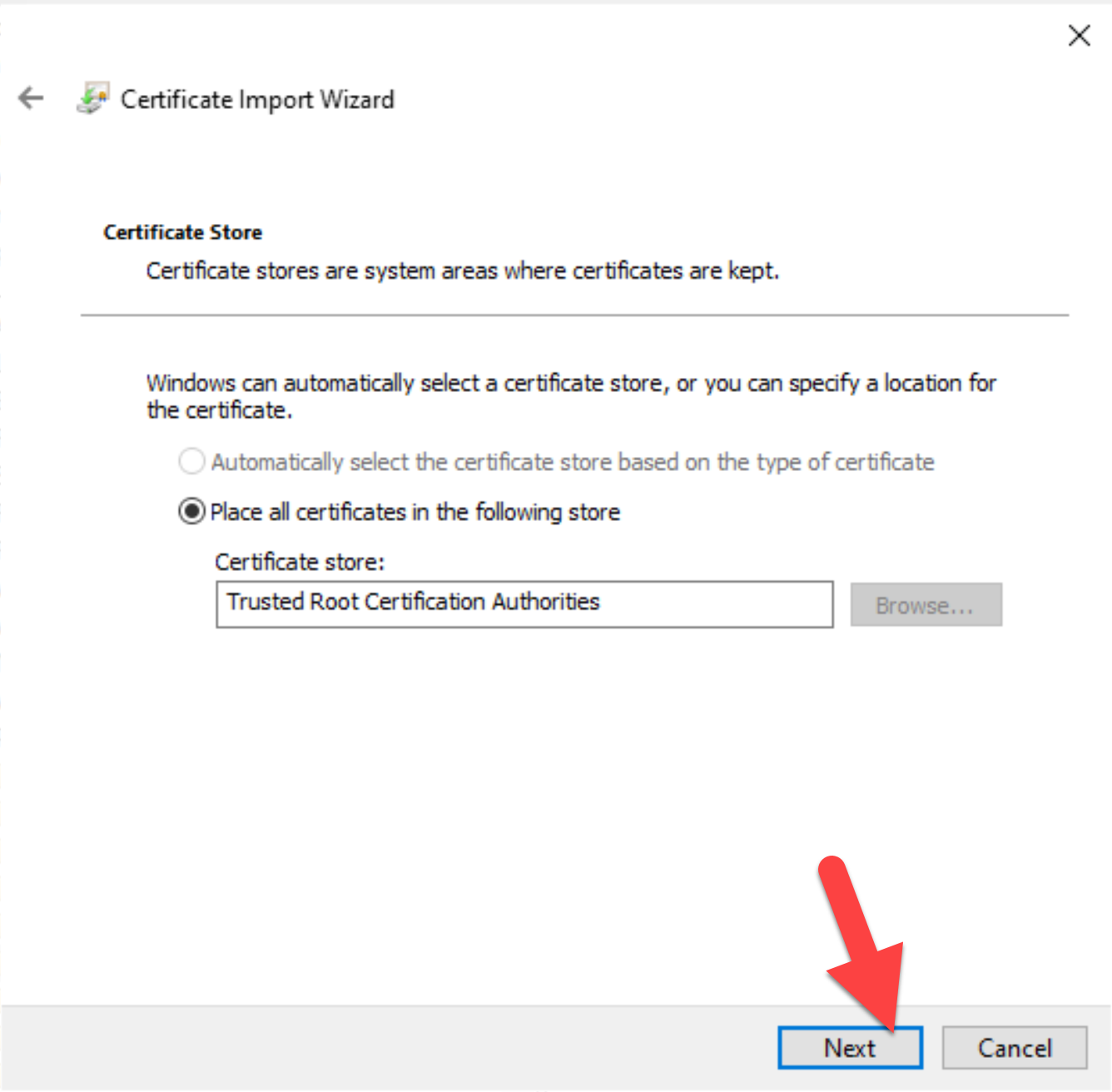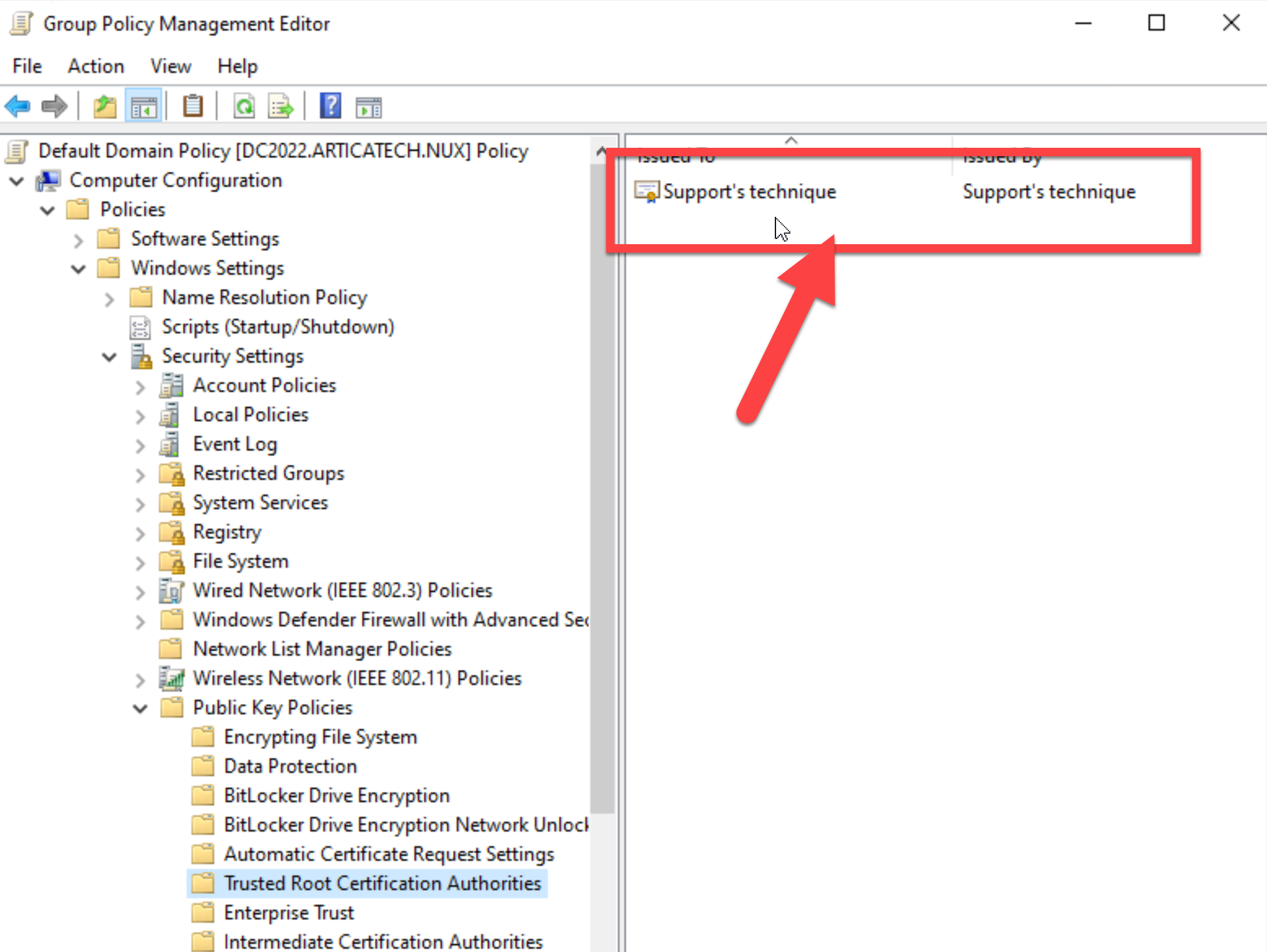 C:\Windows\System32\gpmc.msc) on a computer running Windows 10 or Windows Server.Computer Configuration > Policies > Windows Settings > Security Settings > Public Key Policies > Trusted Root Certification Authorities