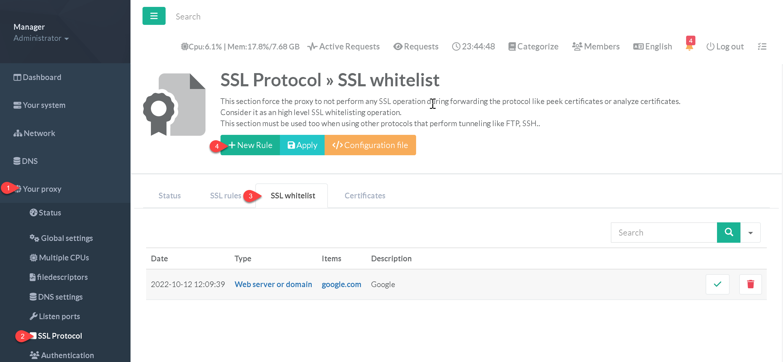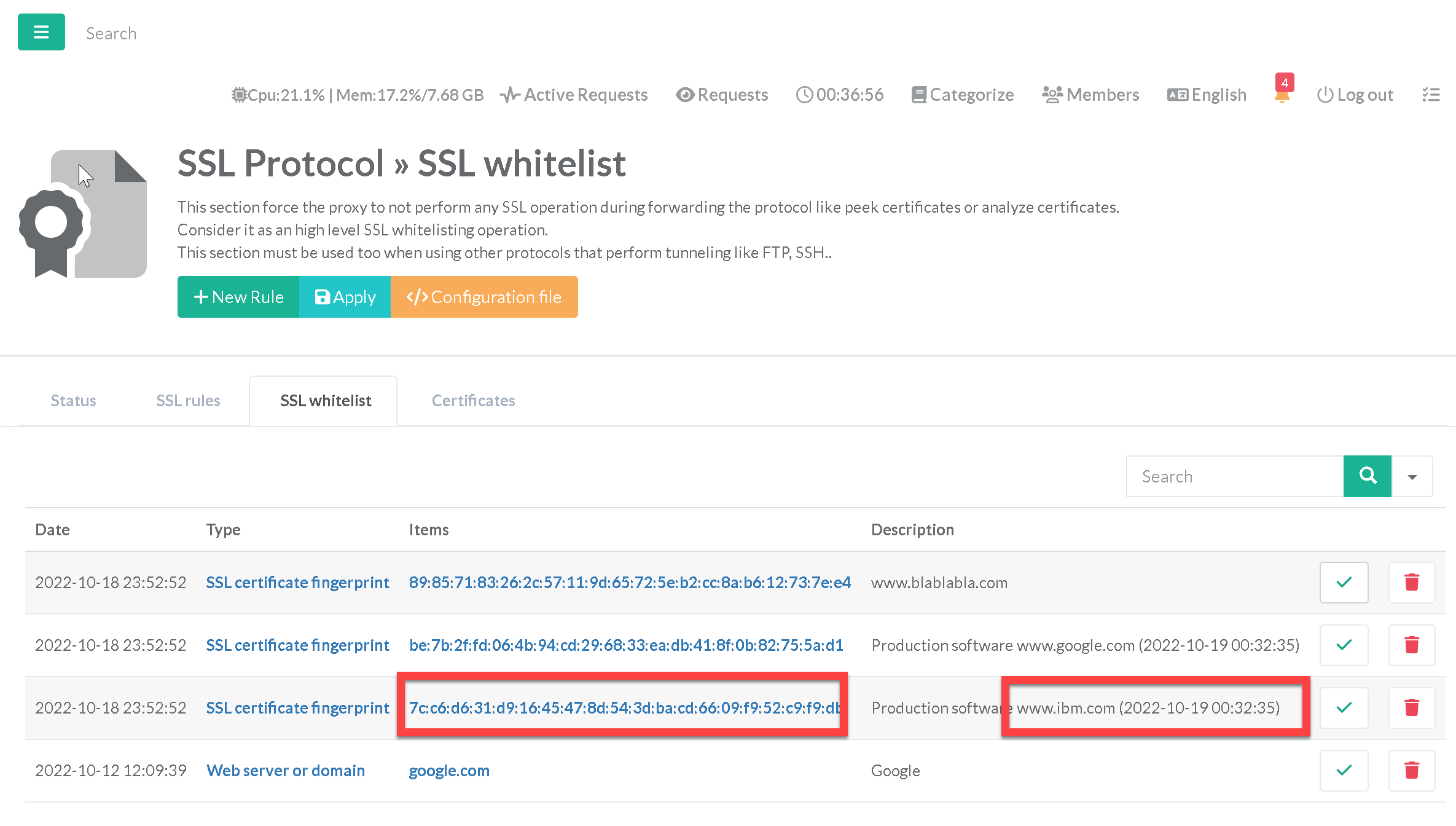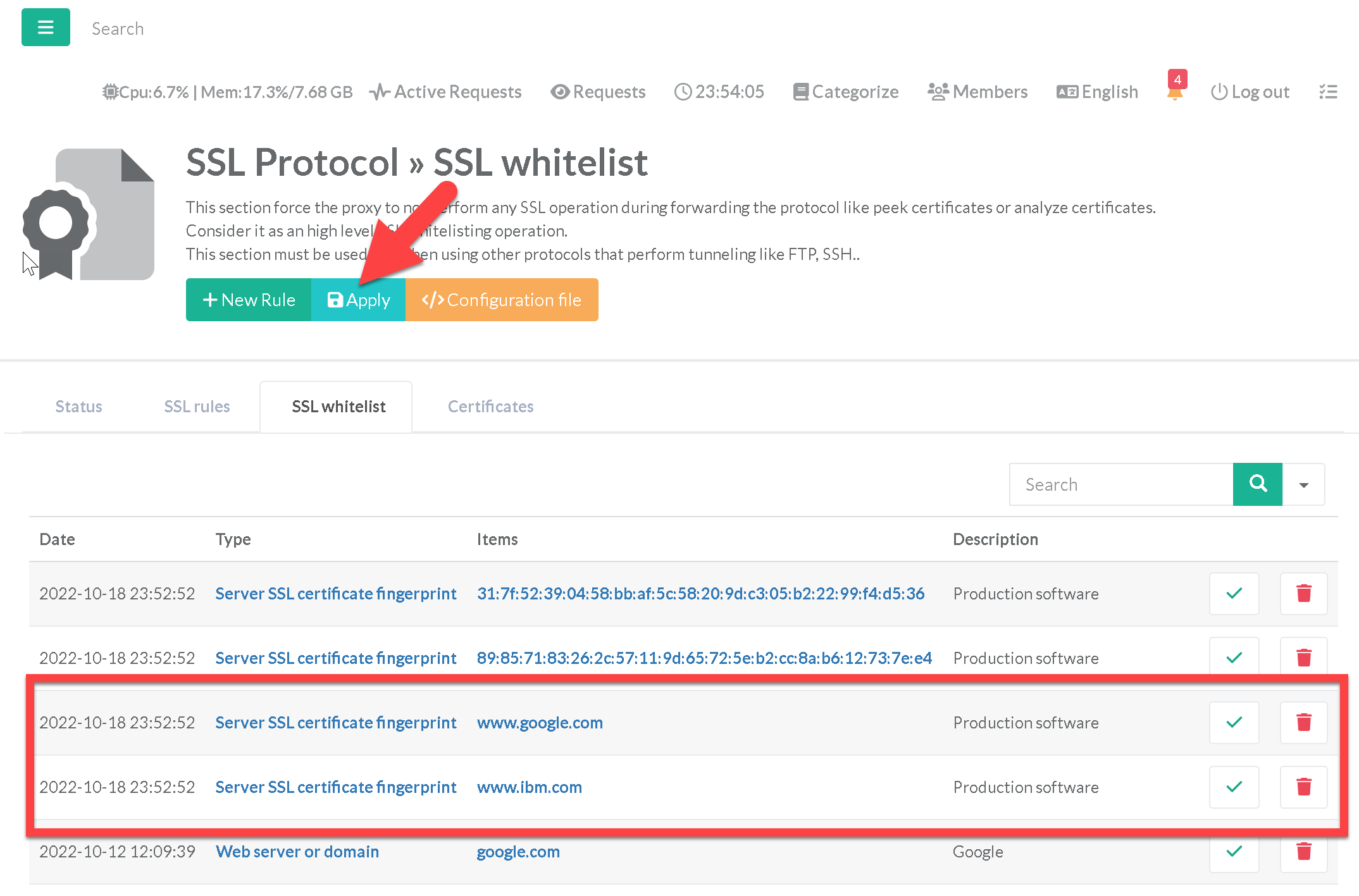On Your Proxy > SSL Protocol, click on SSL Whitelist tab
