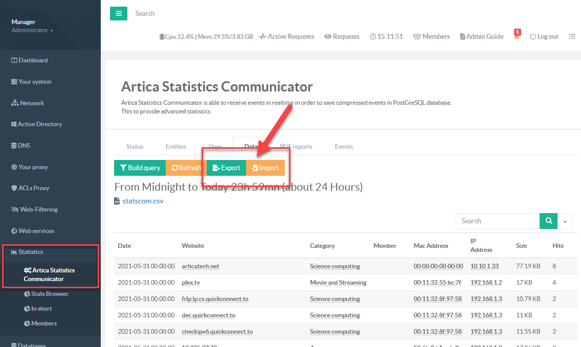 - To perform these operation, on the left menu, choose Statistics / Artica Statistics Communicator