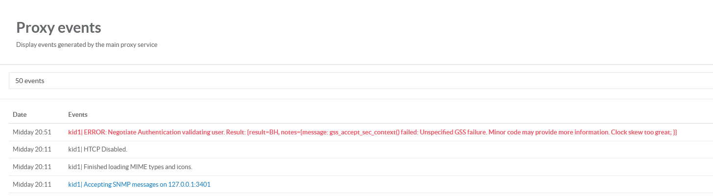 kid1| ERROR: Negotiate Authentication validating user. Result: {result=BH, notes={message: gss_accept_sec_context() failed: Unspecified GSS failure. Minor code may provide more information. Clock skew too great; }}
