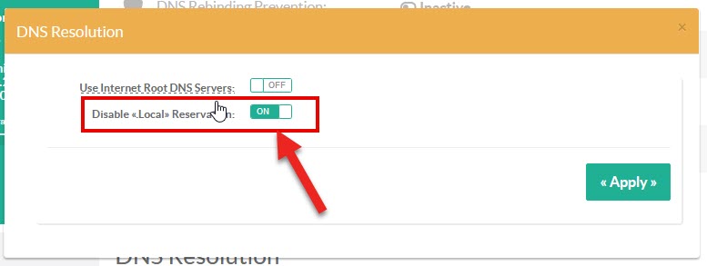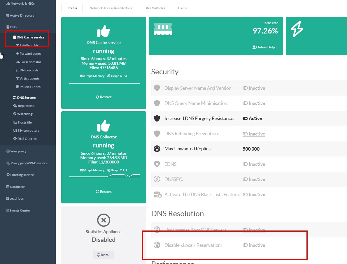 On the left menu, go to DNS > DNS Cache Service and down to βDisable local reservationβ link