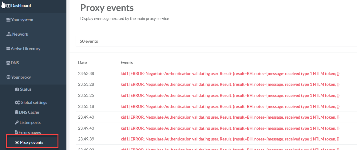 After connecting Artica with kerberos to the Active Directory, browsers display authenticate popups in Proxy events the following error is displayed :