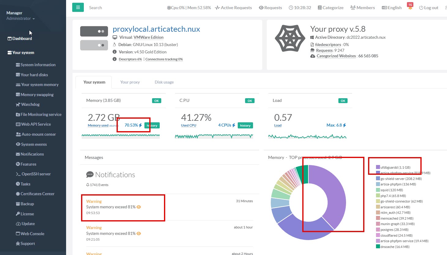 You are concerned about the memory load used by your proxy and it regularly informs you that its memory capacity is reaching the limit.