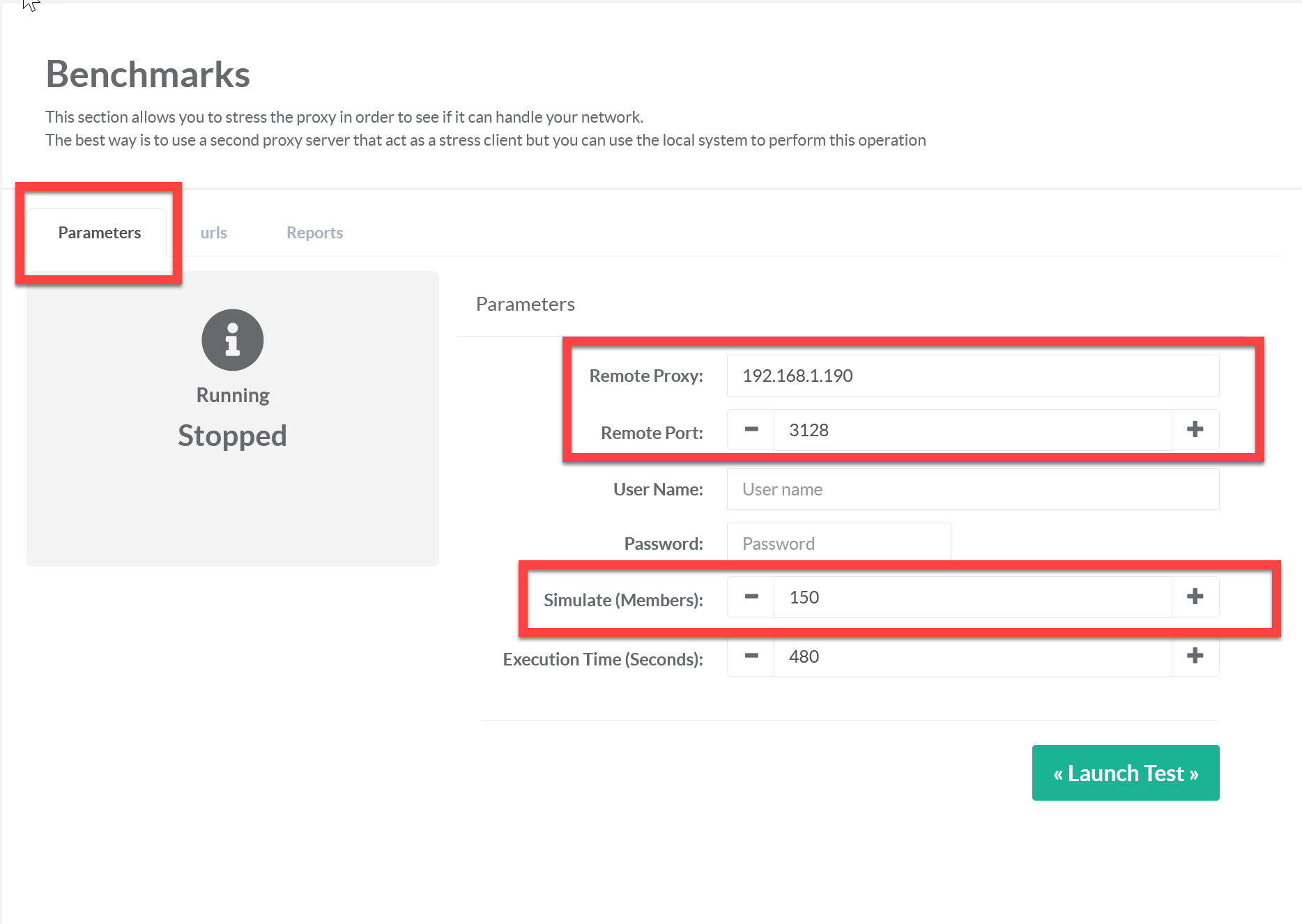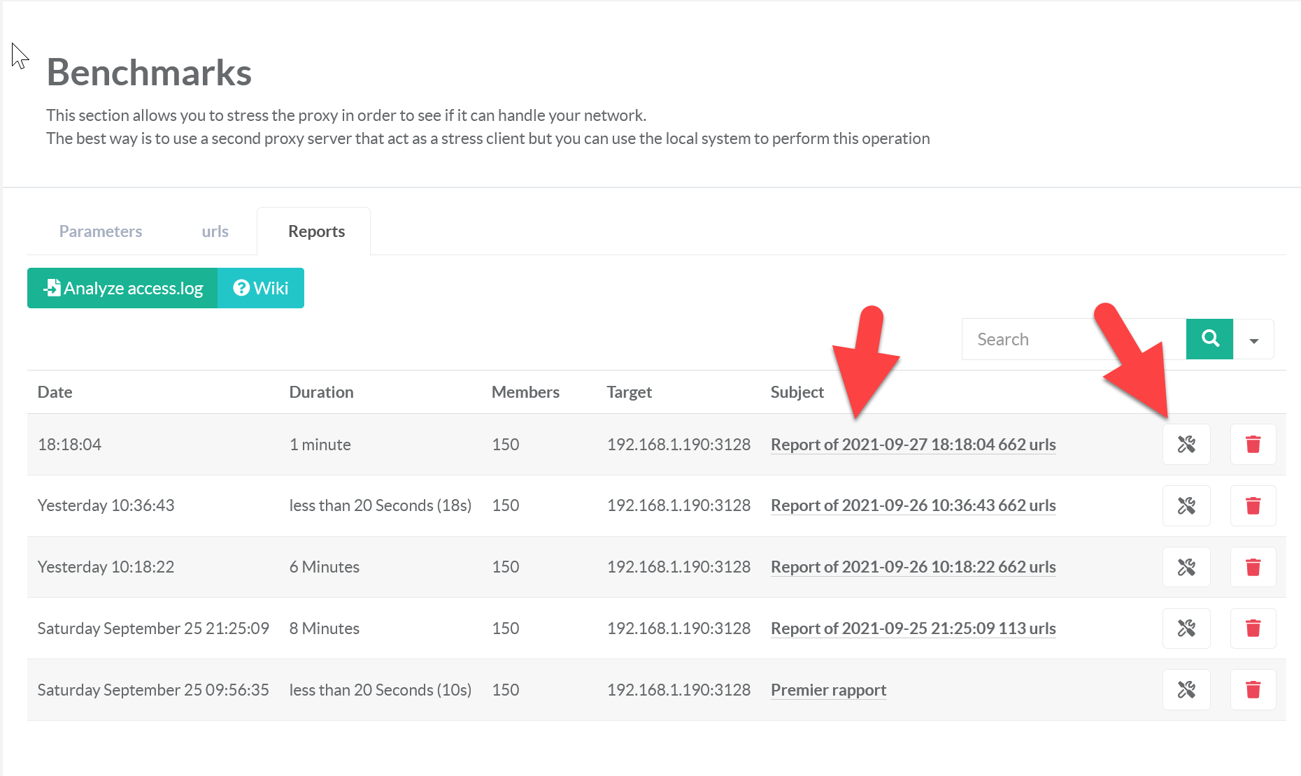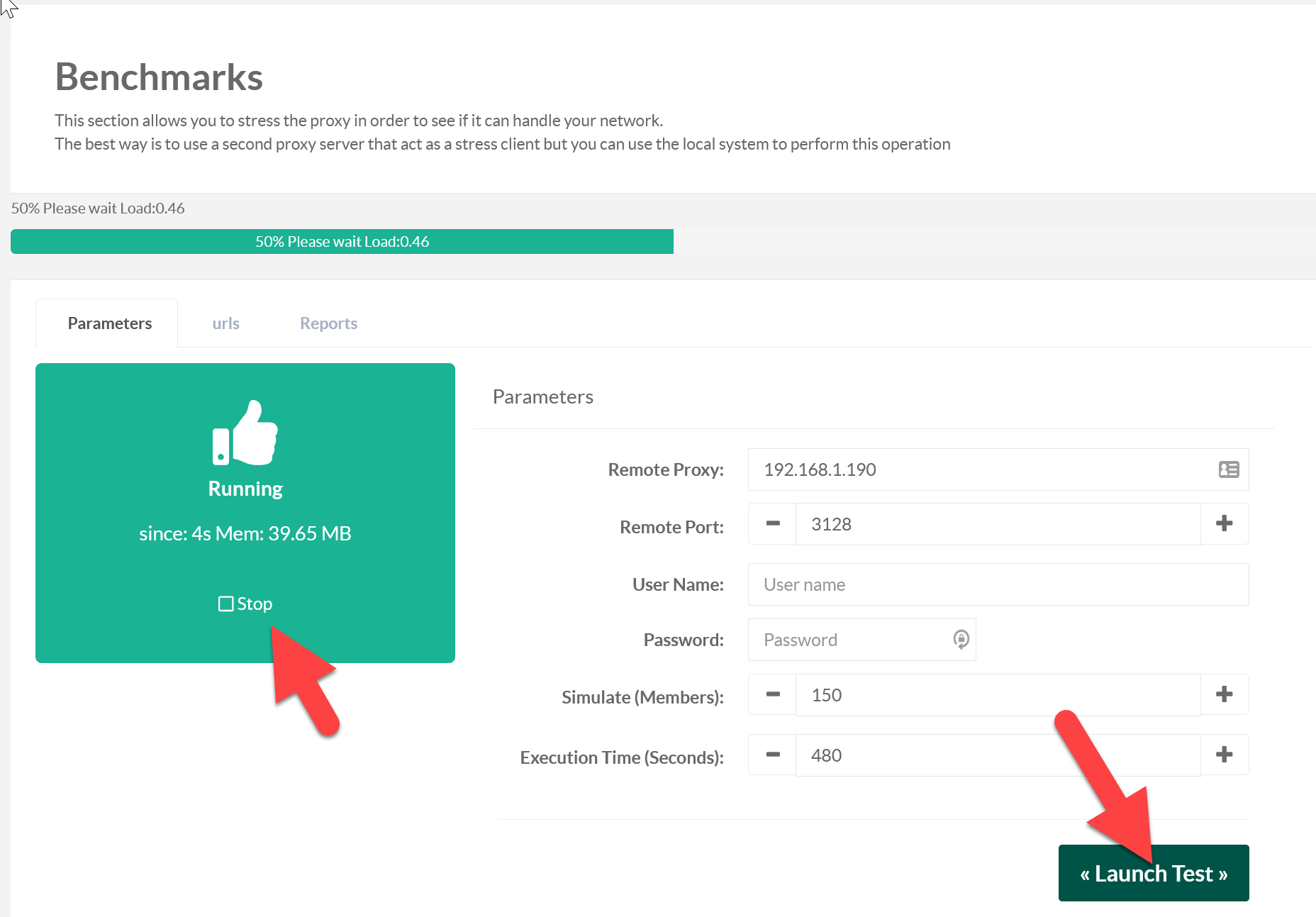 The performance of the Artica server that will perform the stress operations is not to be neglected, above 500 virtual users, it is necessary to increase the number of CPUs. Do not use the stress tool to test Artica Proxy on itself. Stress tool simulates crazy users The stress tool can be found by typing “/siege” in the address bar or in the right barr, select “Benchmarks” in the Tools section |