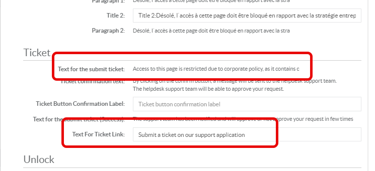 Text for submit the ticket” to explain to the user the process of creating a ticket with your support system.Text for Ticket link".