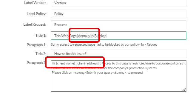 <a href="http://myWebapp.app?submit=yes&domain=<domain>&user=<client_name>&ip=<real_ip>">Click here</a> to complains about the blocked [domain] domain.