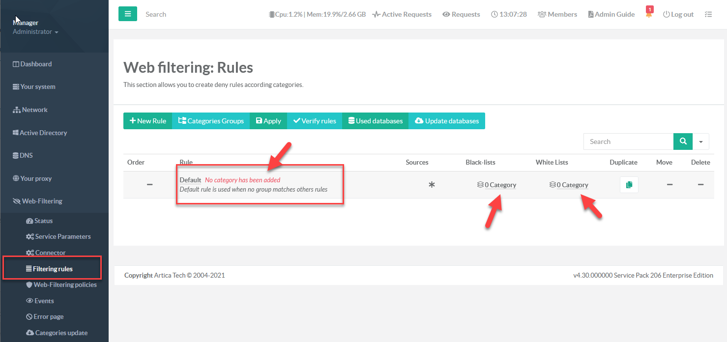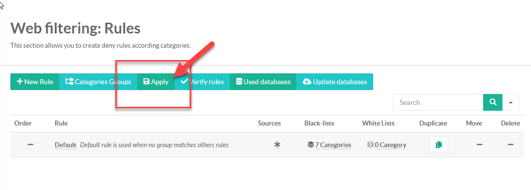- By default, the default rule contains not category, click on the link under the blacklist column in order to add categories you want to block