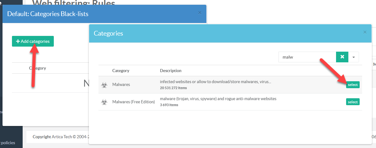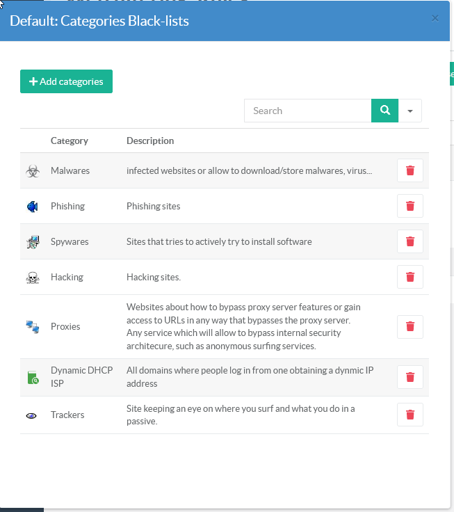 - Click on Add Categories button to browse available categories list and add them into the blacklist container of the default rule.