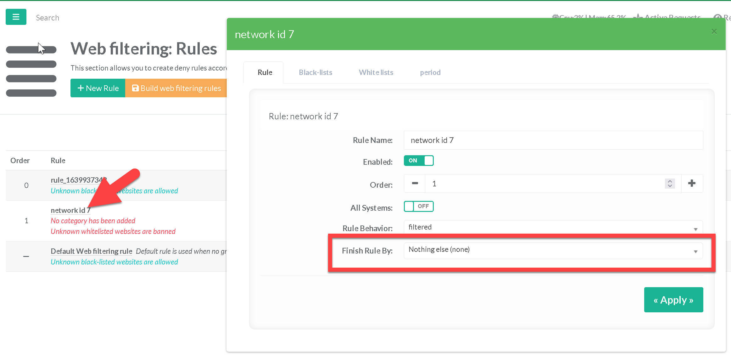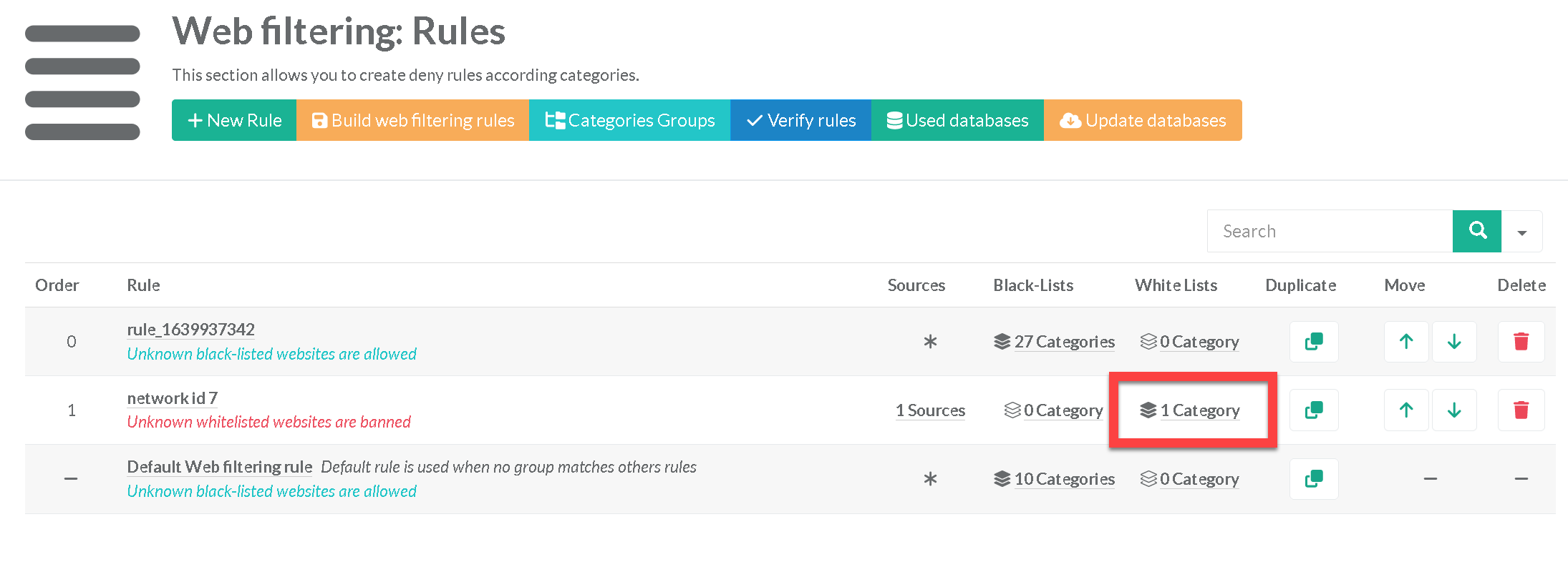 Whereas a filter rule blocks sites hosted by blacklisted categories, this rule bans all sites not referenced in white lists.