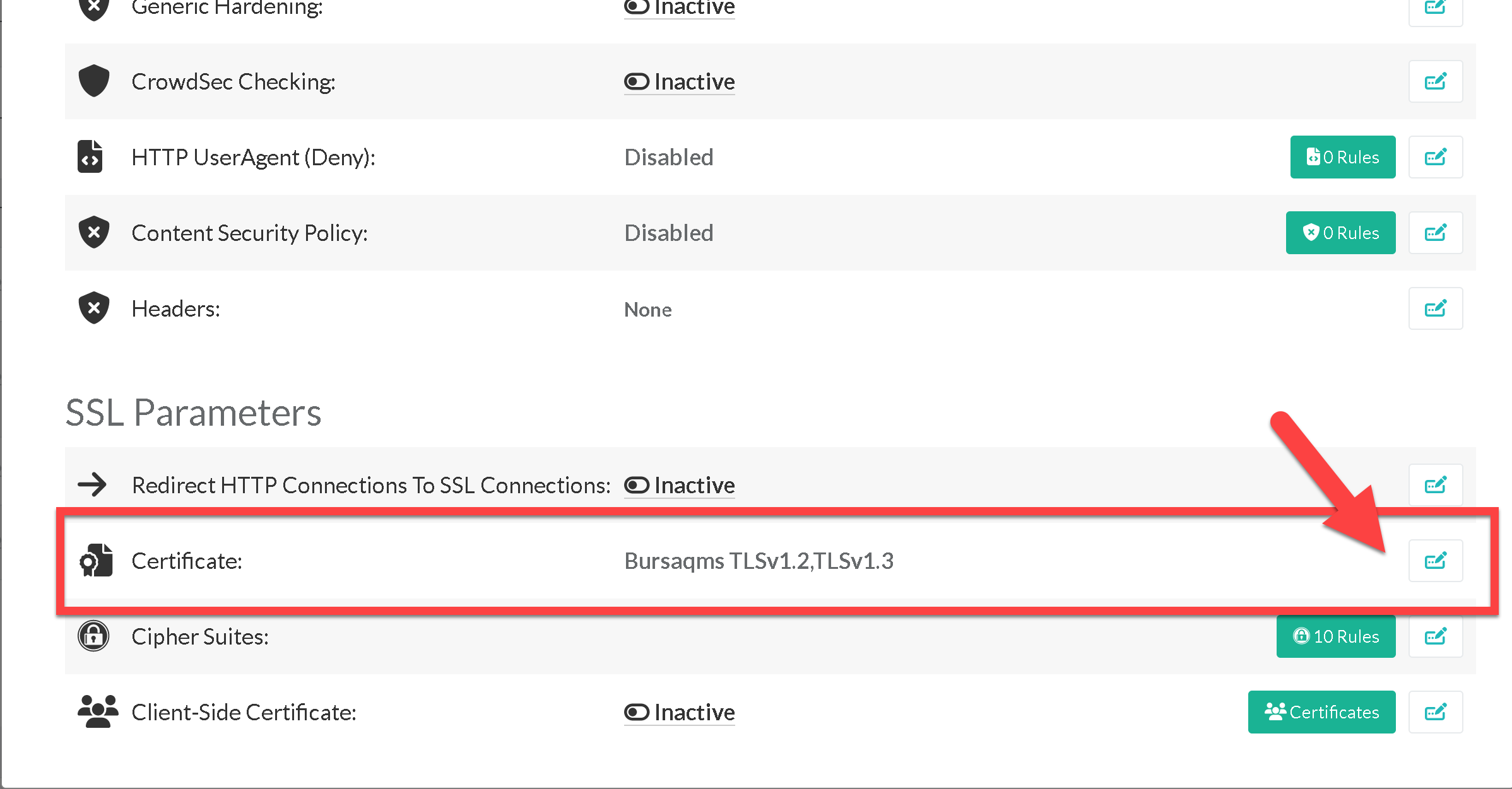 On the Ports section, remove any 80 HTTP port and create a 443 + SSL port.