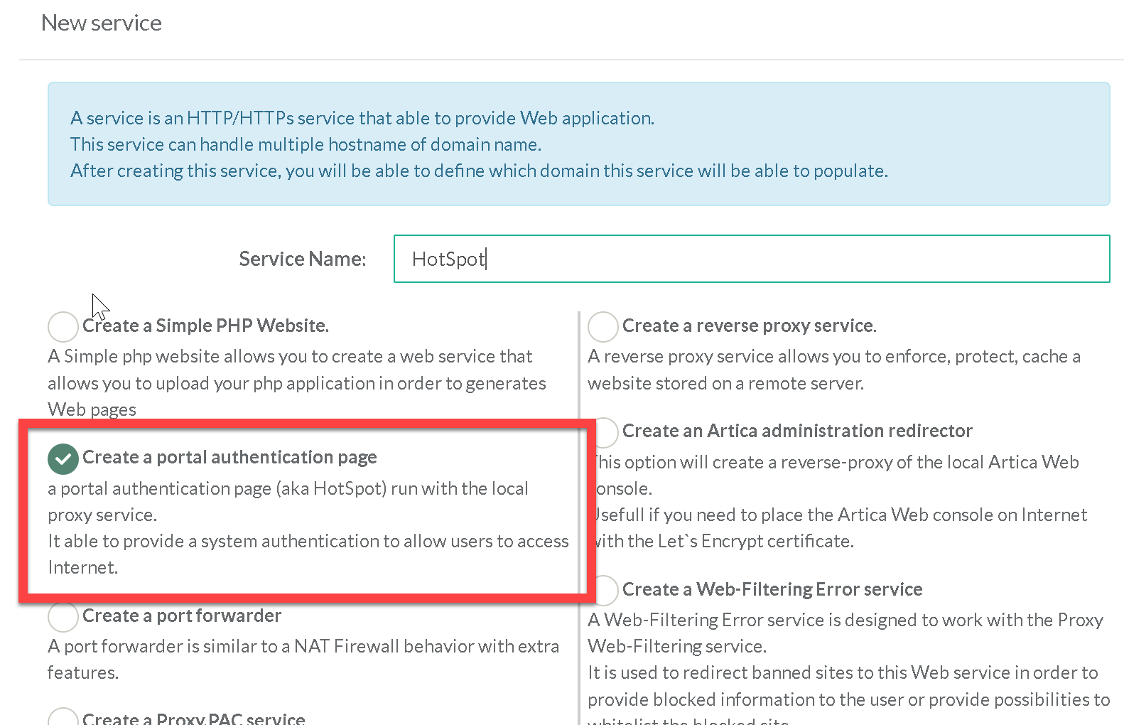 Choose “Create a portal authentication page” Click on Add button