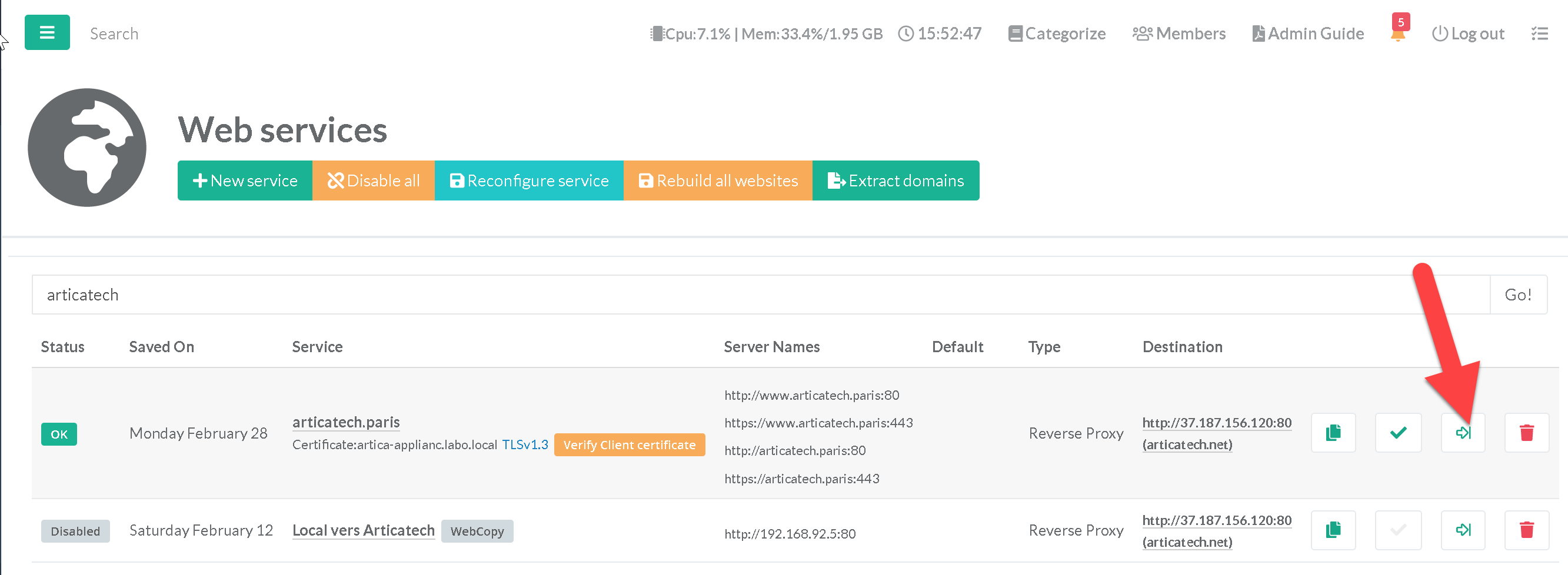Click on the right arrow in the penultimate column to compile website parameters into production mode.