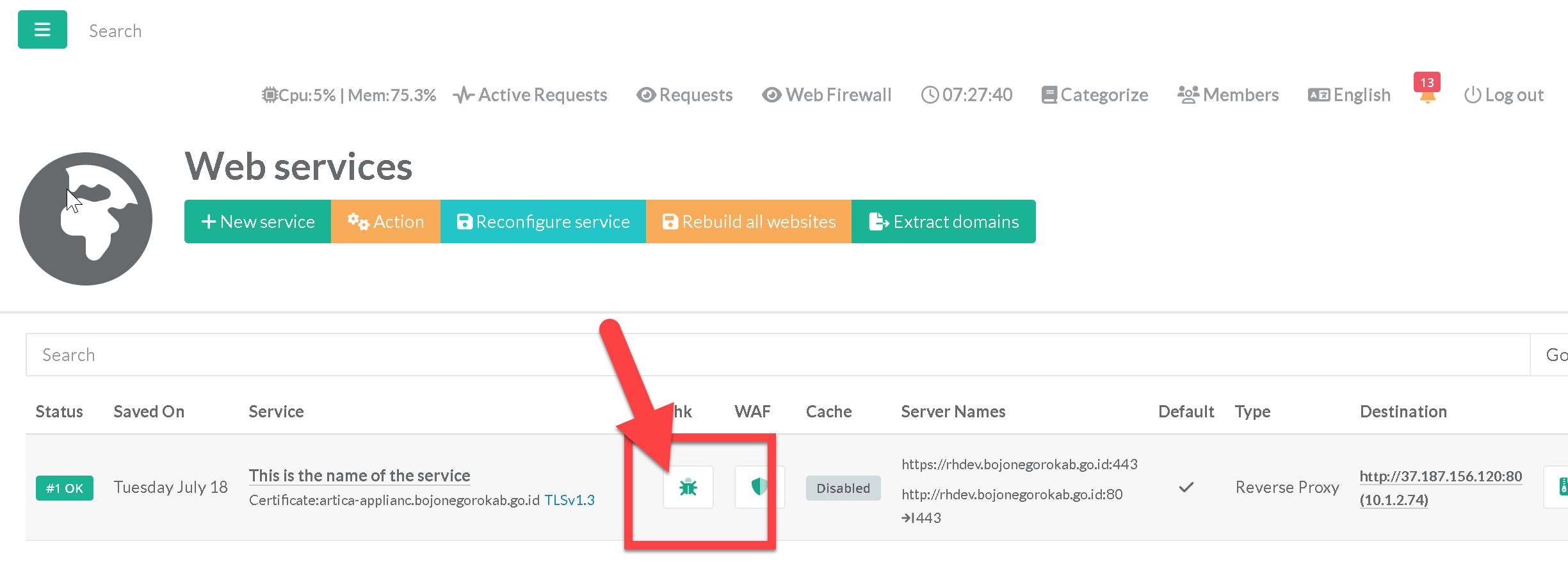 This feature allows you to check that exchanges with websites are taking place correctly from the reverse-proxy.