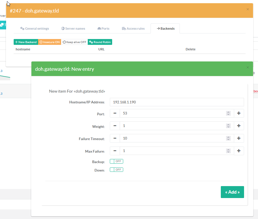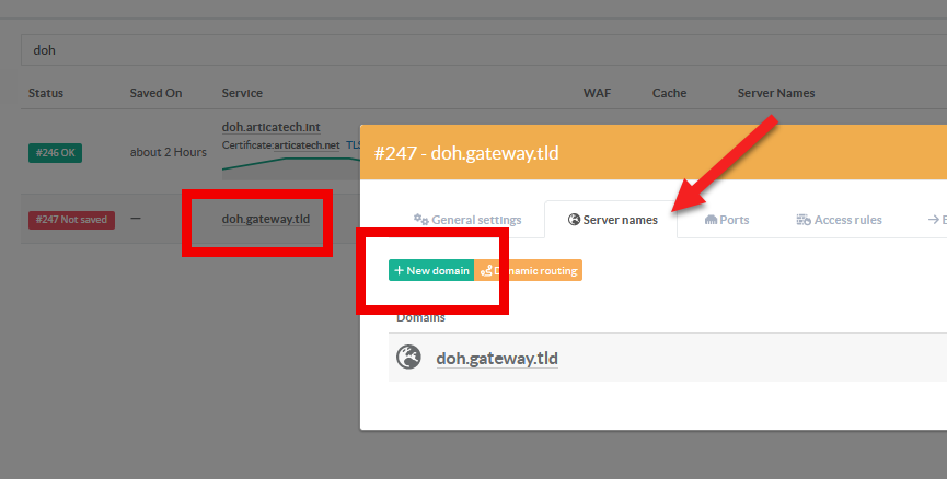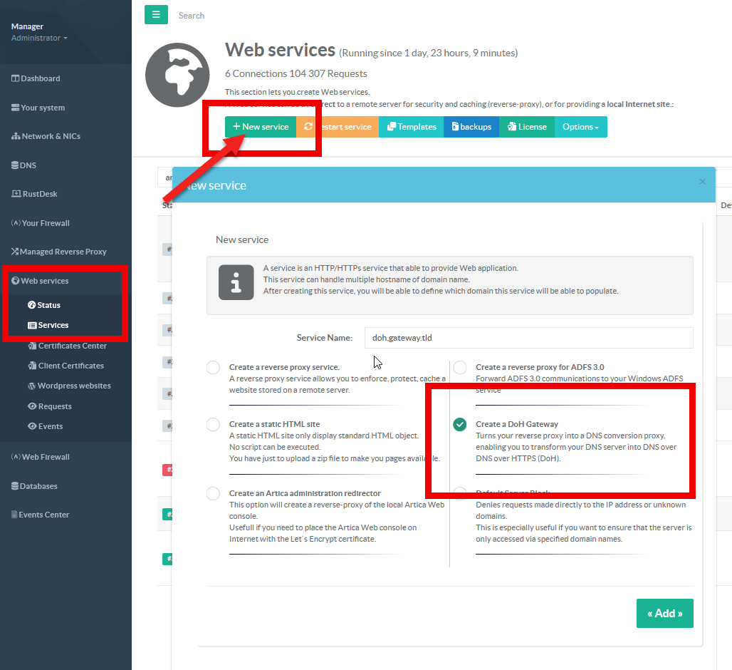 Web services > ServicesNew service buttonCreate a DoH Gateway